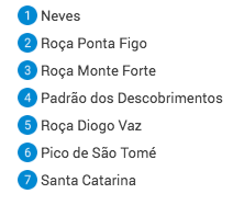 | Monteforte Padrão dos Descobrimentos (marco do descobrimento do arquipélago – Ana Ambó) | marca o local onde os navegadores portugueses João de Santarém, Pêro Escobar e João de Paiva desembarcaram pela 1ª vez em 1470 em São Tomé. (da capital – 35,8km – 1h) |