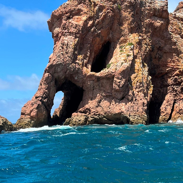 com rochas de várias tonalidades, oscilando os tons da água entre o azulado e esverdeado. Passa-se ao largo da Fortaleza
