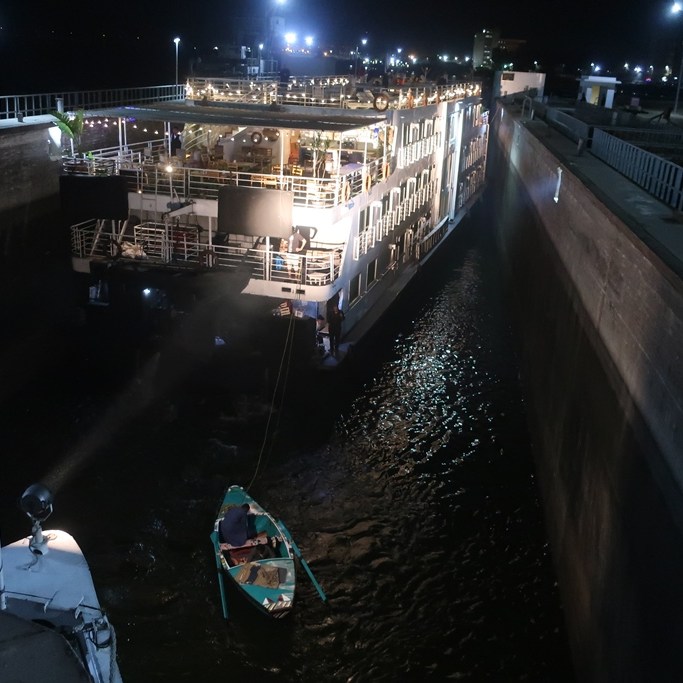 Depois do jantar, tendo nós tido conhecimento que os navios iriam passar nas comportas de Esna quisemos vivenciar esses momentos tendo para tal, ido para o deck superior do navio.