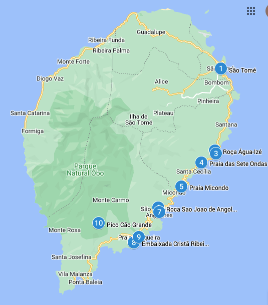 Nós acabámos por conseguir fazer quase todos os pontos de interesse assinalados, tendo apenas cumprido 2 – no trajeto para o sul: Roça São João dos Angolares e Pico Cão Grande, (porque apanhámos um dia bastante chuvoso) tendo feito os outros na subida em direção à capital.