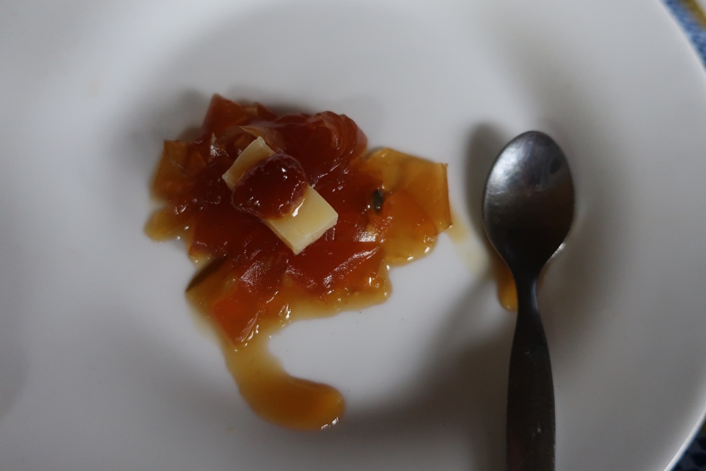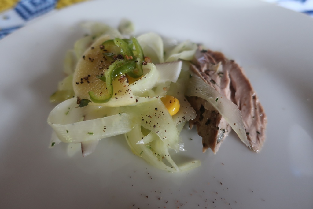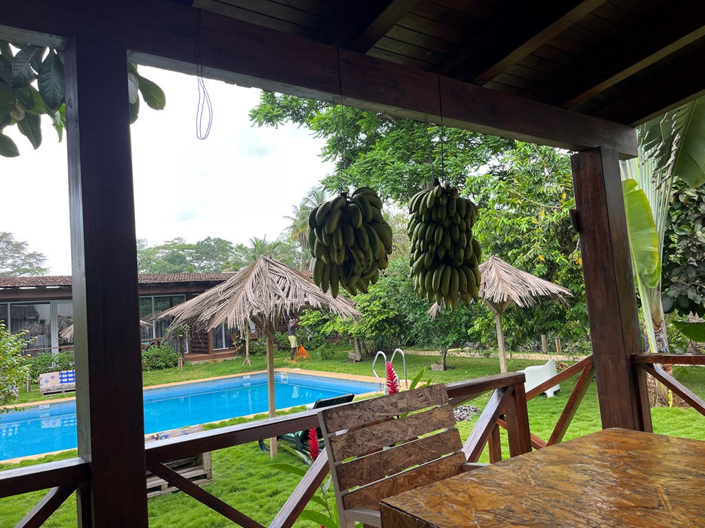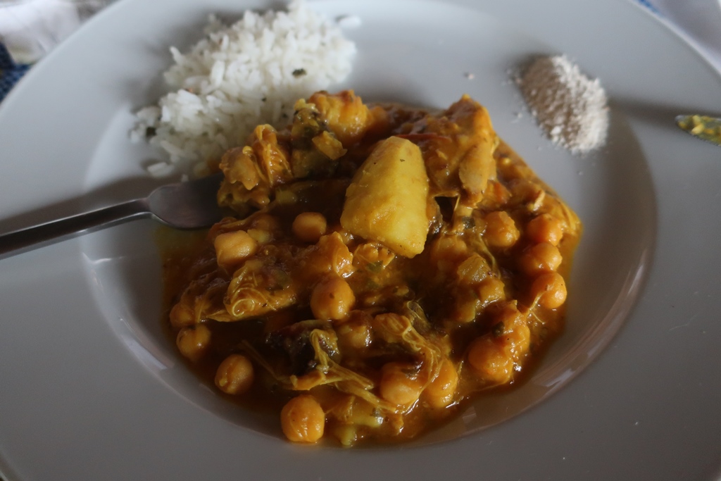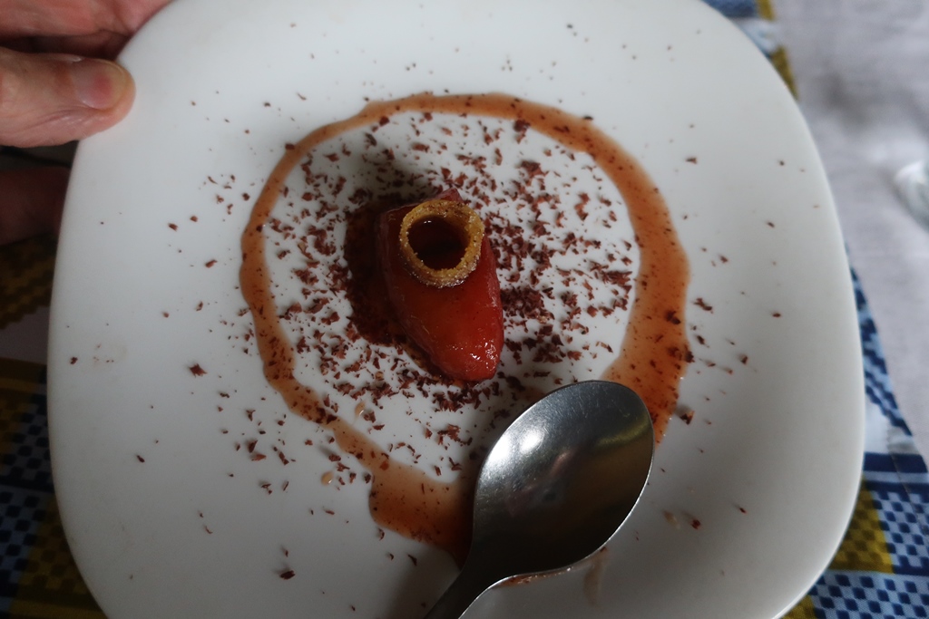 O almoço na Roça São dos Angolares foi uma experiência divinal por vários motivos: pelo espaço, pela vista deslumbrante (pena estar a chover!) e pelas iguarias confecionadas pelo famoso chef João Carlos Silva (tornado célebre com o programa televisivo – Na Roça com os Tachos). A refeição constou de várias entradas, a seguir às quais serviam um tira gosto, seguida de pratos principais e ainda sobremesas servidas por um staff extremamente simpático e afável que ia explicando o nome e os ingredientes que faziam parte de cada prato.
