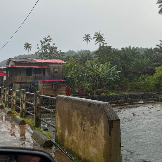 Tendo saído da capital a meio da manhã sem no entanto ter conseguido o propósito (levantar dinheiro) e tendo antecipadamente reservado mesa no restaurante da Roça de São João dos Angolares e por o dia estar de chuva, não conseguimos cumprir os pontos que nos tínhamos proposto visitar (a Roça Água Izé, a Boca do Inferno e as praias). Fomos gozando uma paisagem verdejante contrastando de quando em vez com crianças e adultos com indumentárias de cores diversificadas, ao longo da estrada.