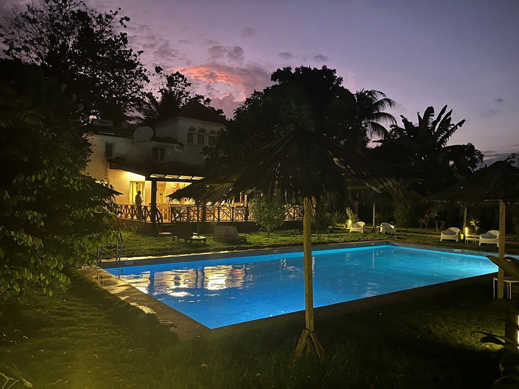 Dirigimo-nos para a Roça Santo António Ecolodge onde iríamos jantar e pernoitar. (As suas imediações estavam a ser melhoradas). Foi uma noite agradável. Após o jantar convivemos e conversámos com as pessoas que estavam a explorar a Roça, tendo adquirido mais algum conhecimento acerca da ilha. O espaço de restauração era à beira da piscina o que tornava esses momentos duplamente agradáveis: pela riqueza e diversidade de iguarias e pela presença da água.