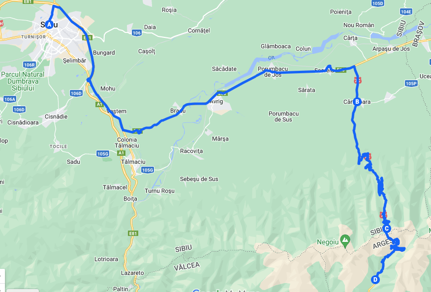| TRAJETO com início em Sibiu até Bucareste Sibiu – Cartisoara – Lago Bâlea (77 km – 1h 30 min) Lago Bâlea – Lago e Barragem Vidraru – Curtea de Arges – *Poenari – Bucareste (300 km – 4 h) |