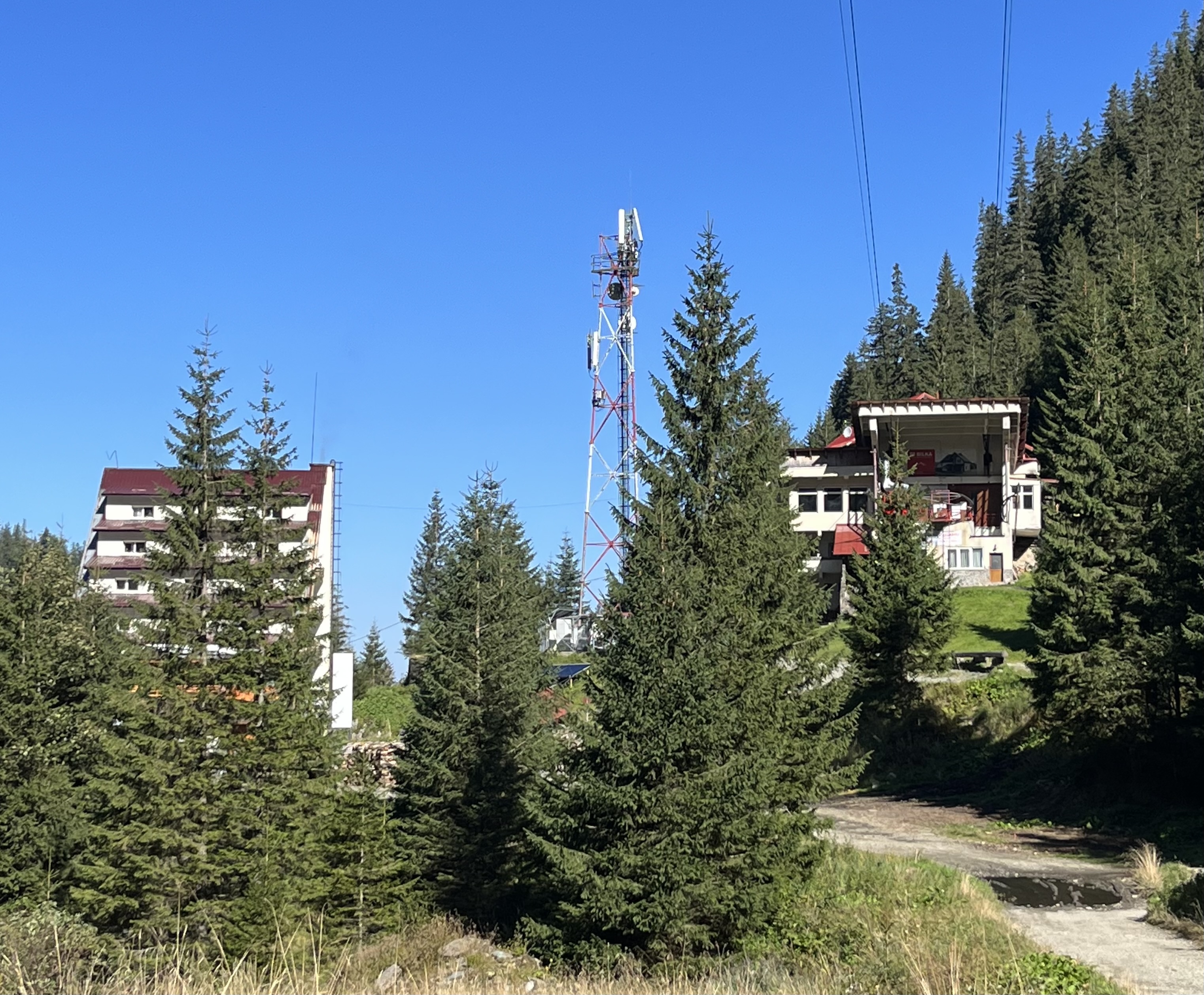 Antes de nos instalarmos nesse espaço, ainda aproveitámos para subir mais um pouco a pé, com o intuito de obter uma perspetiva superior da estrada Transfăgărășan e ir junto da Telecabina, pois a nossa intenção era fazer um trajeto de teleférico após o almoço. Seria uma descida de cerca de 800 metros. Verificámos que não estava em funcionamento devido a algumas reparações.