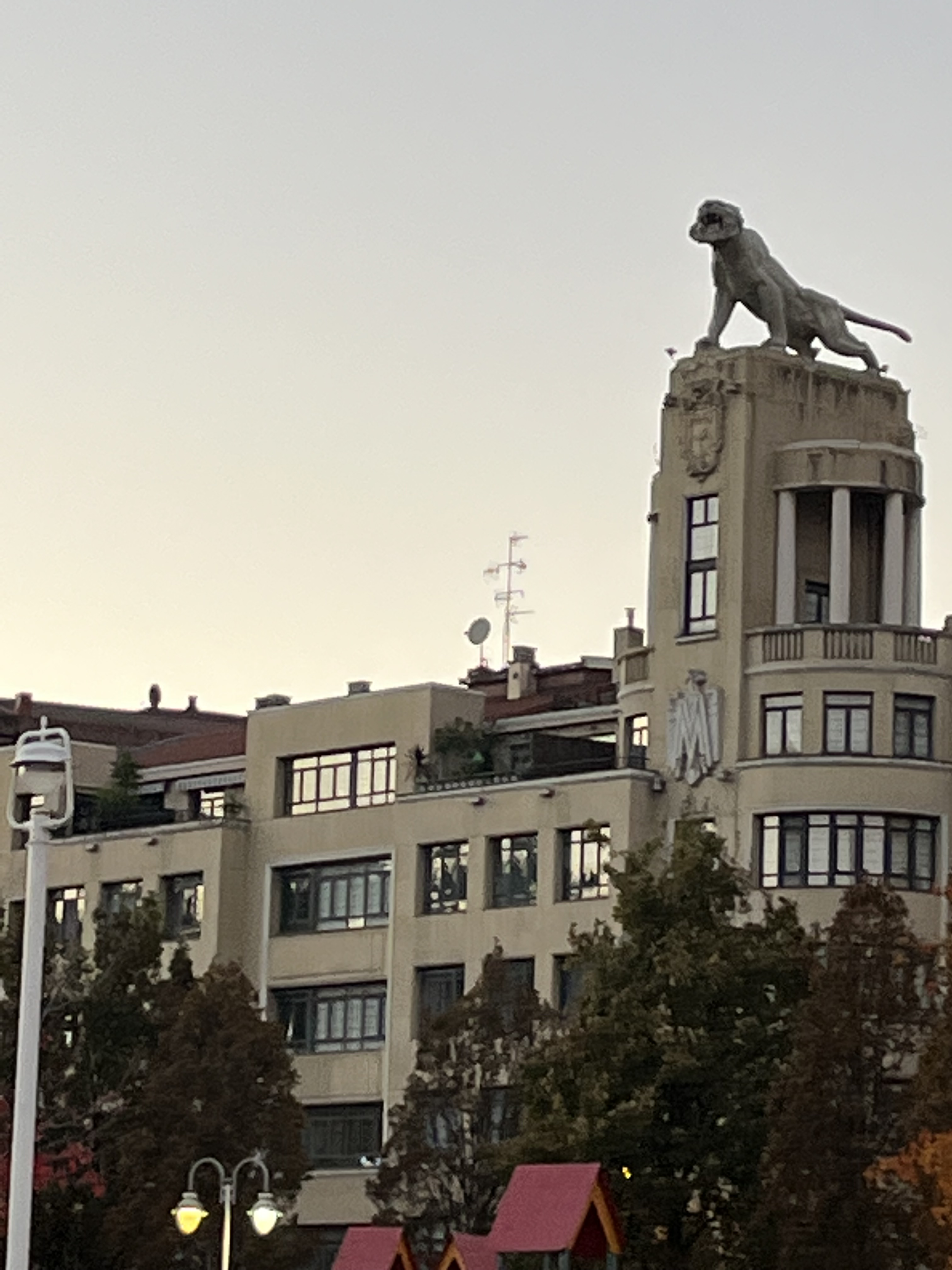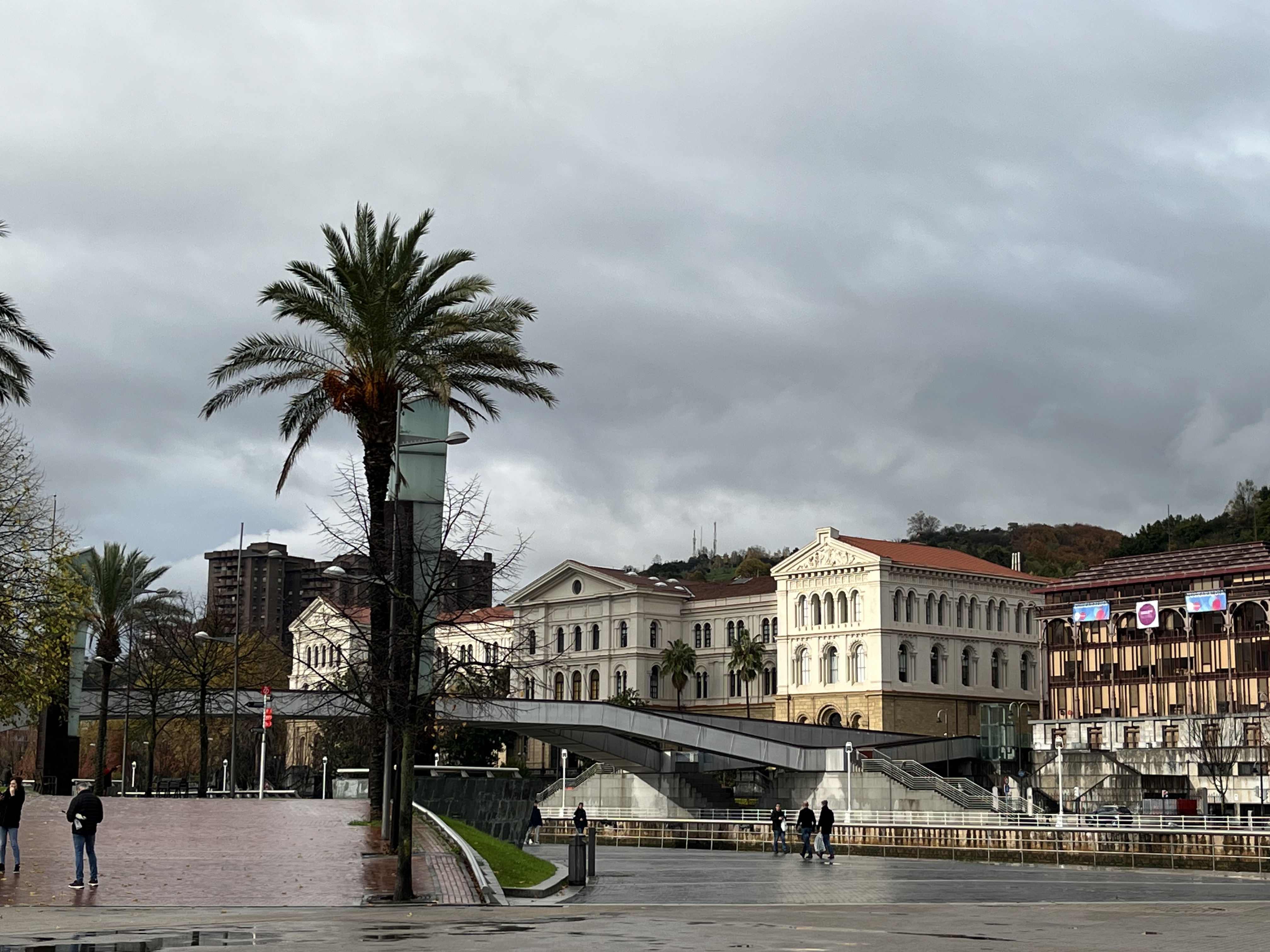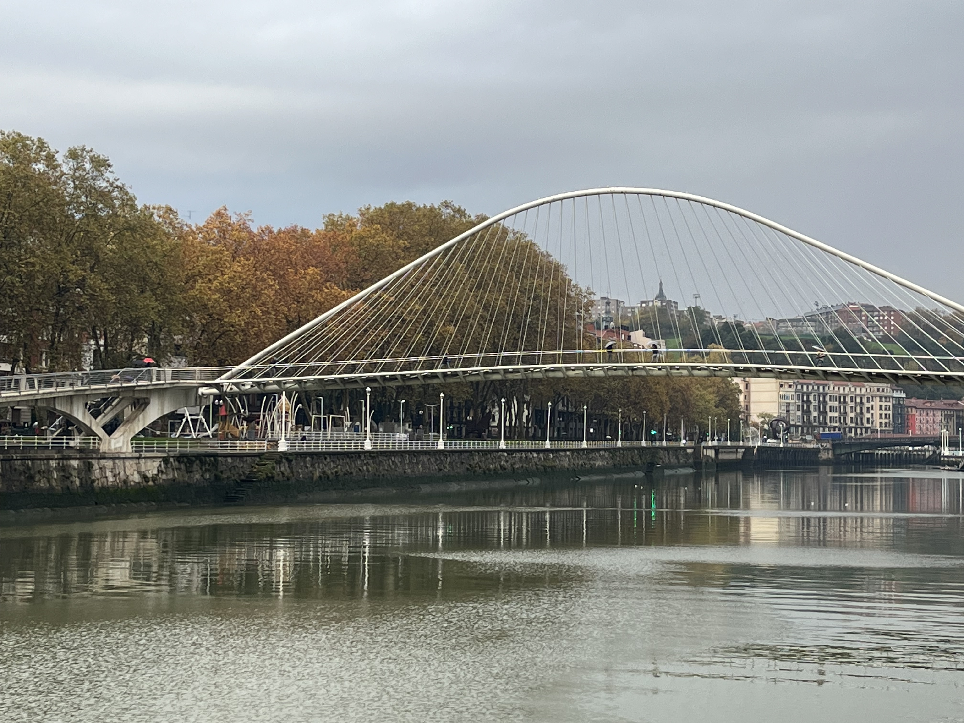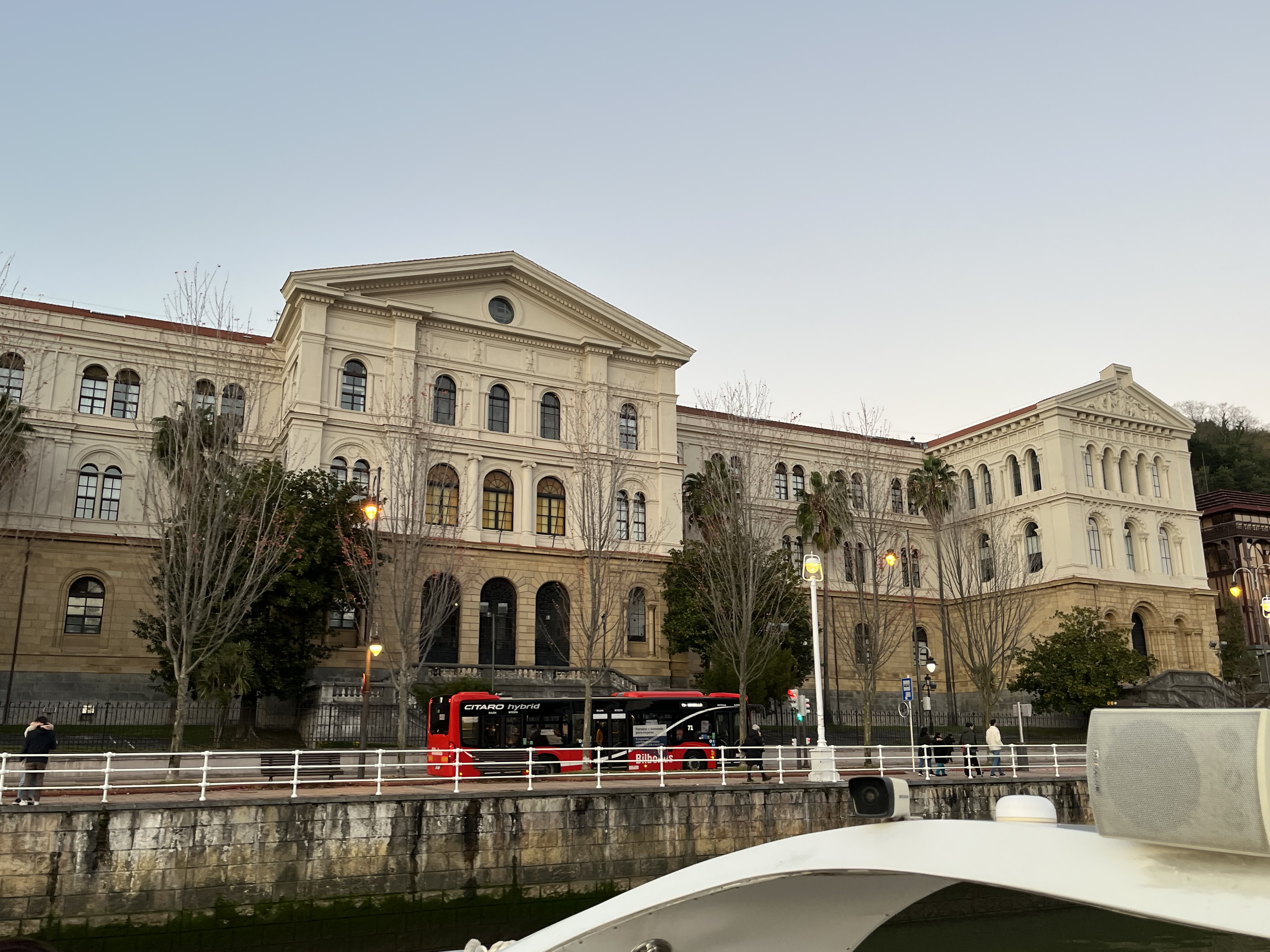 Na outra margem (do lado direito) já tínhamos perante os nossos olhares a ponte Pedro Arrupe e a Universidade de Deusto. Imediatamente a seguir já tínhamos mais uma ponte, a de Deusto bem como um edifício imponente engalanado com a estátua de um leão.
