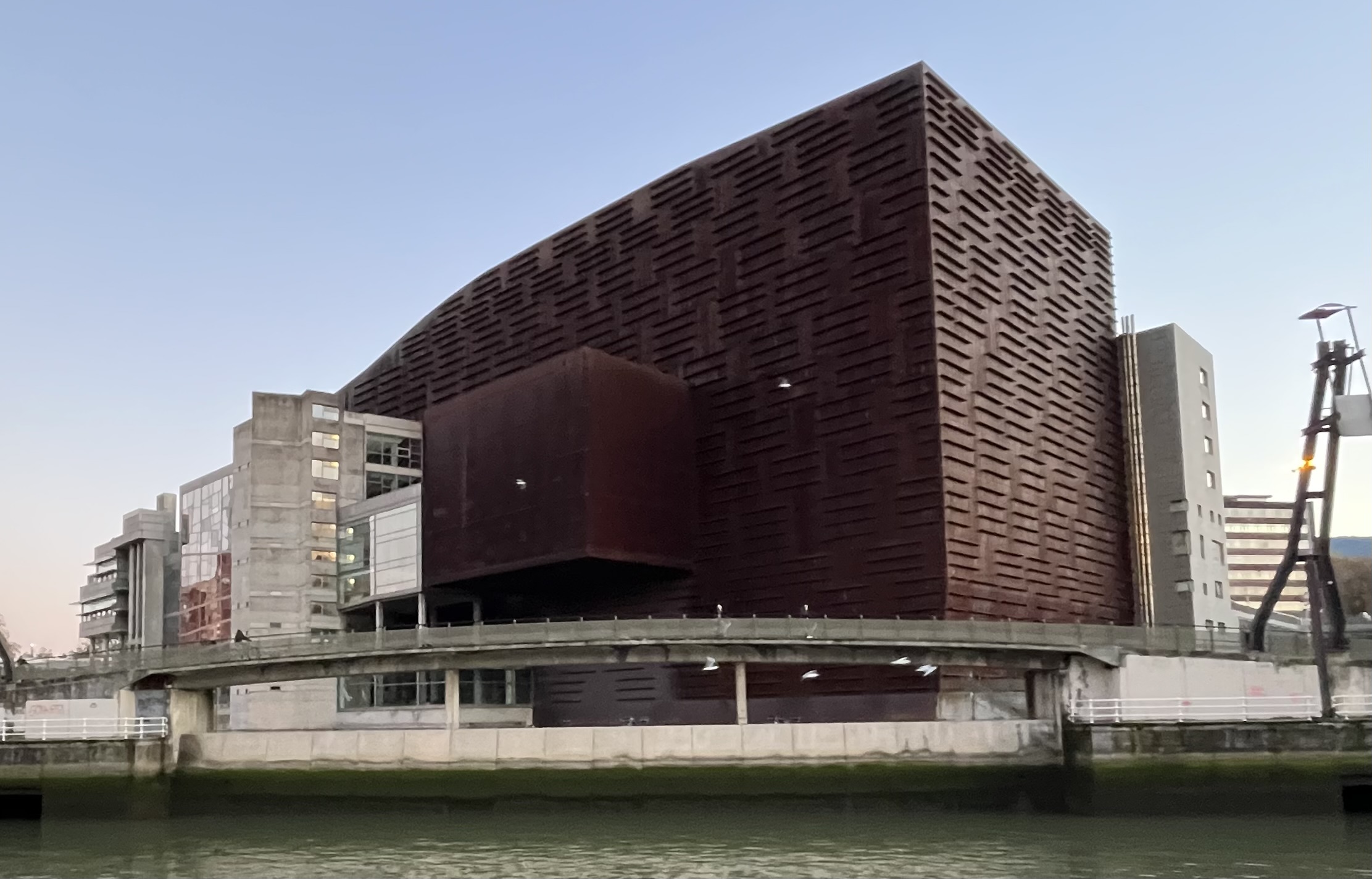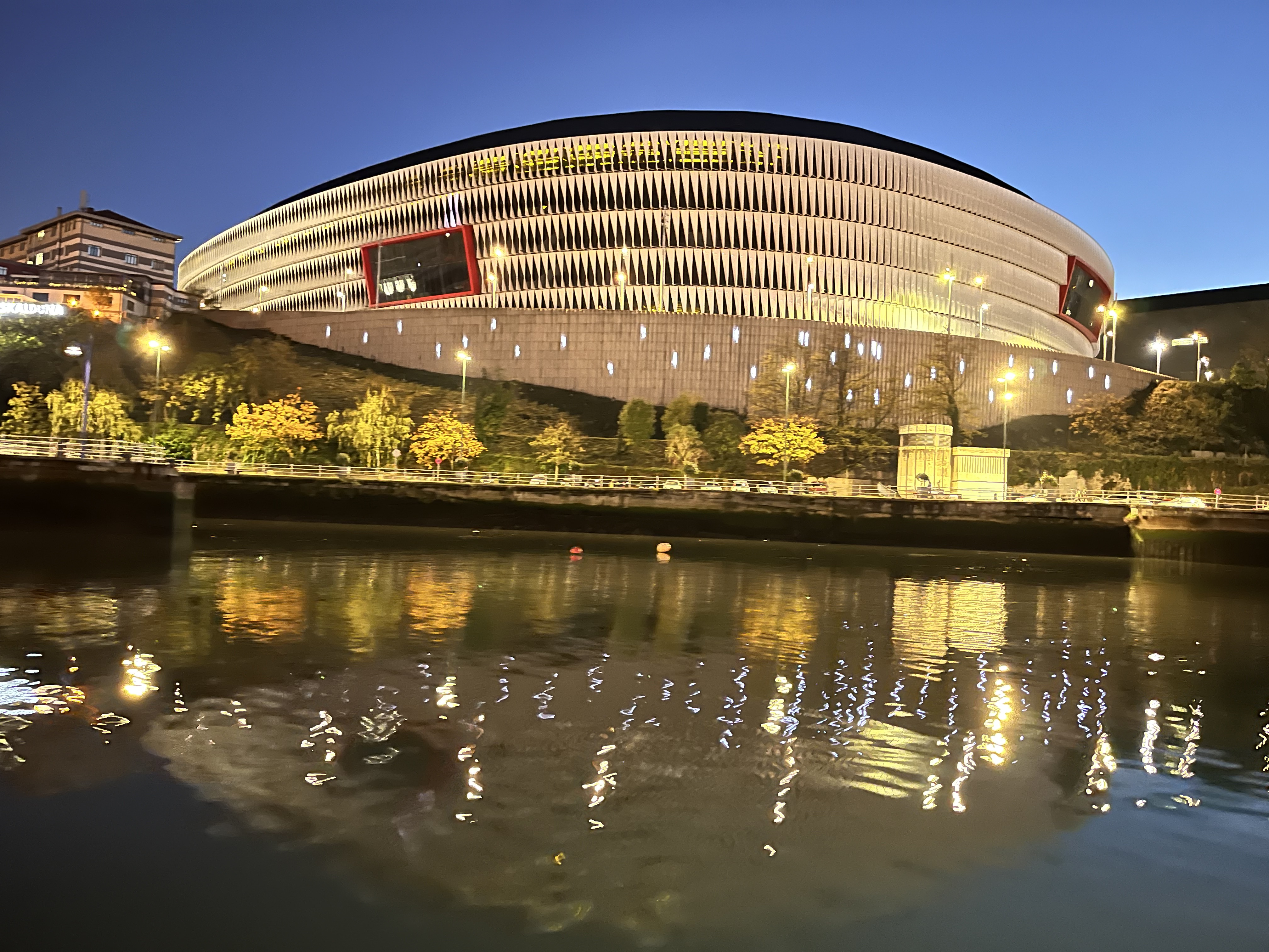 Conduzindo os olhares para a margem esquerda, já com alguma iluminação, tínhamos ao dispor e mais de perto o edifício Iberdrola, o Palácio e a ponte Euskalduna bem como o Museu Marítimo e o estádio San Mamés.