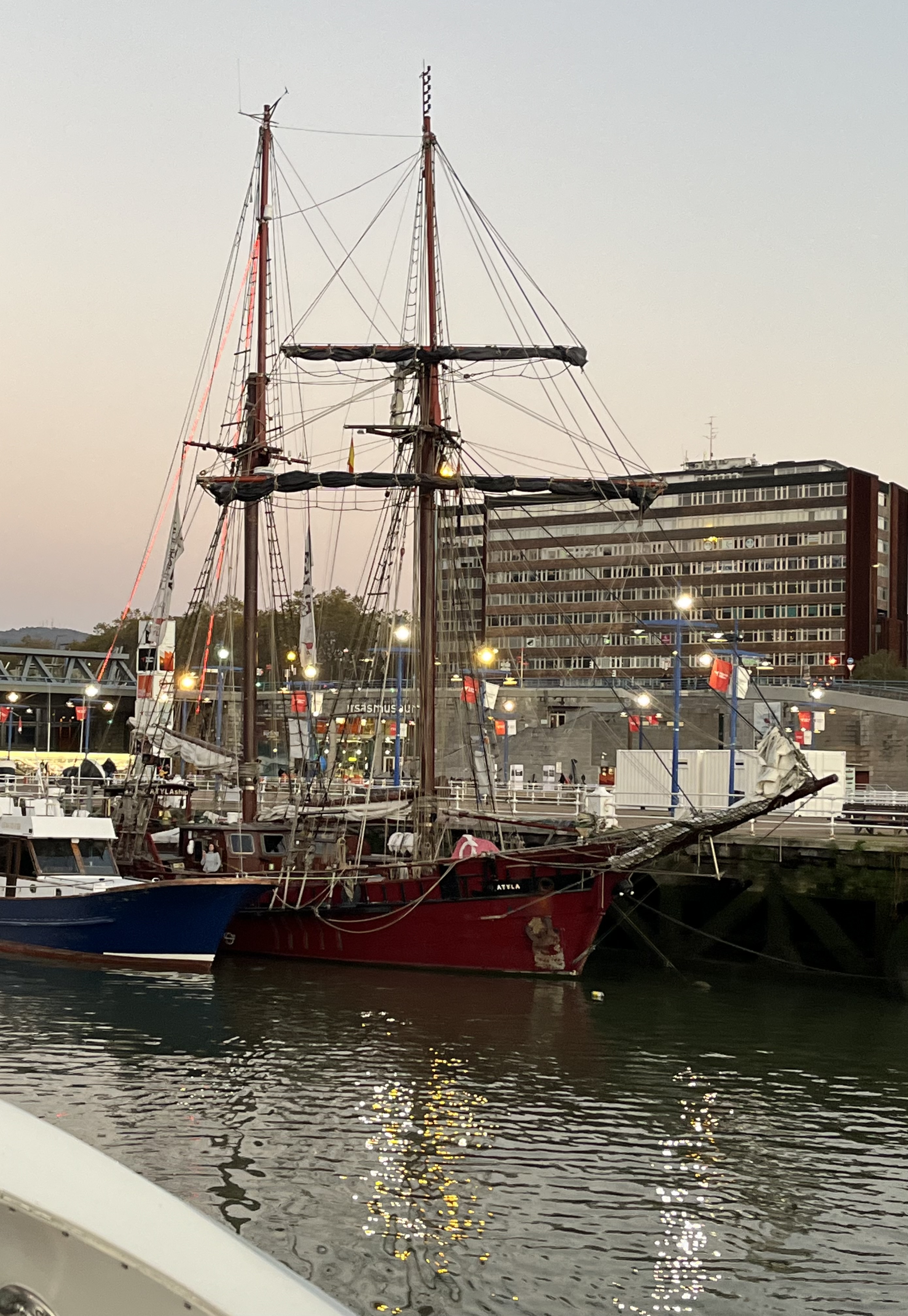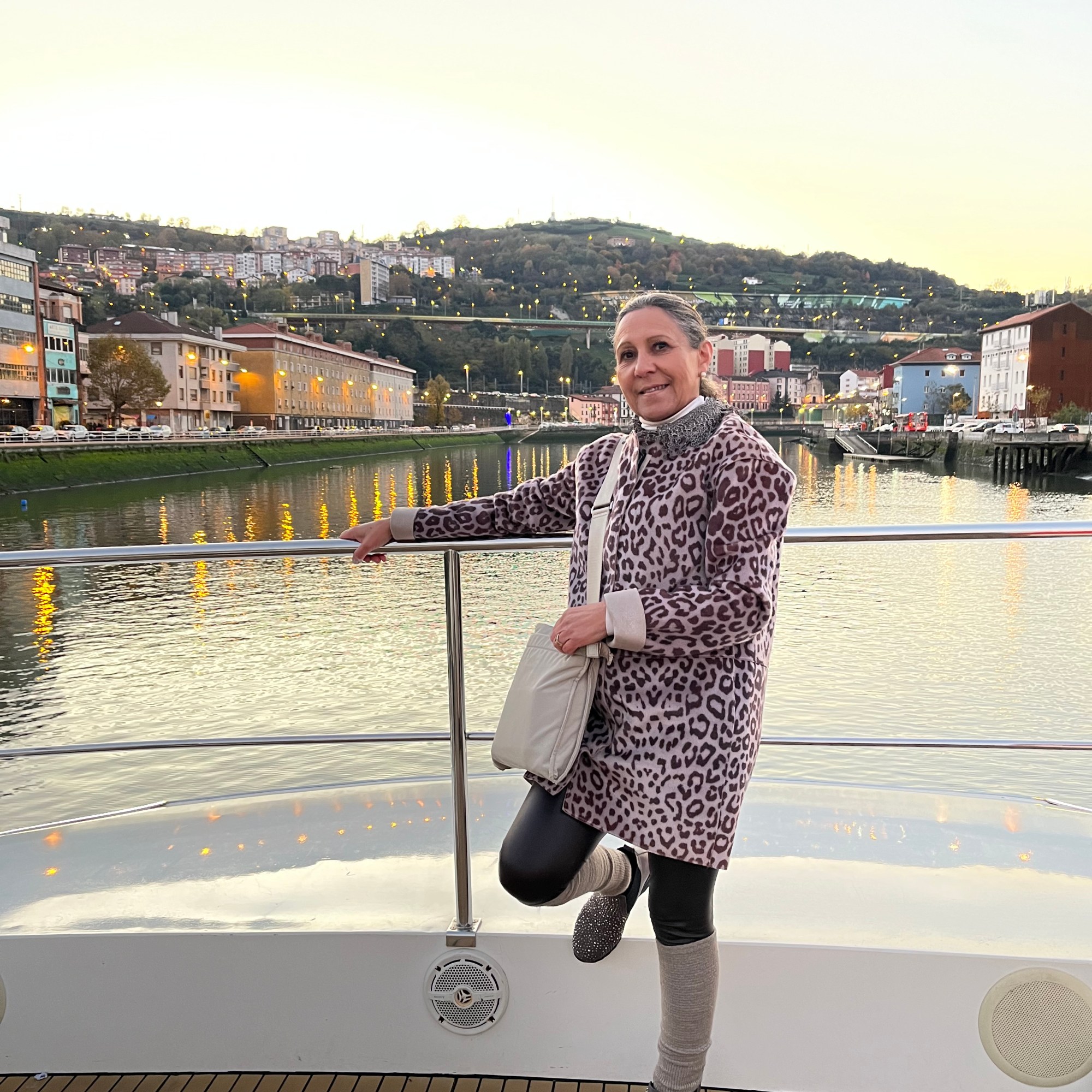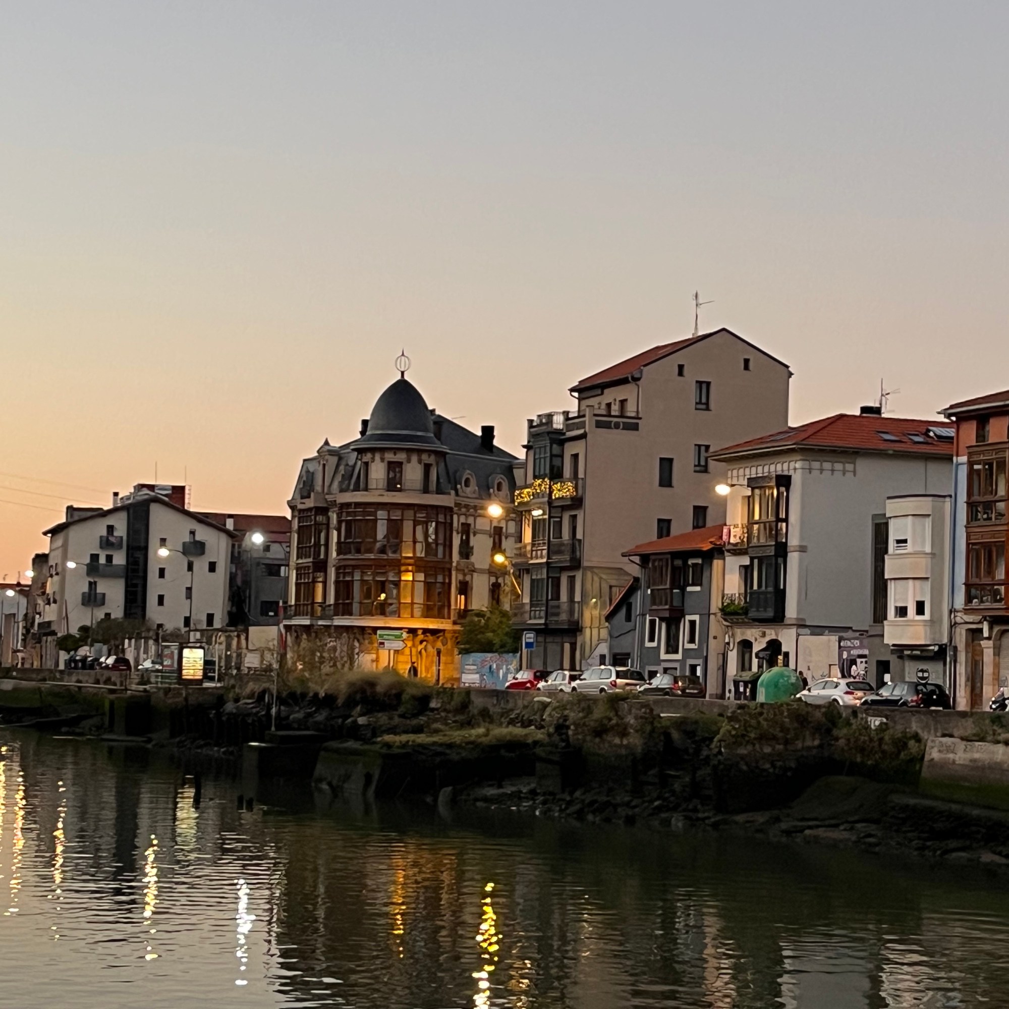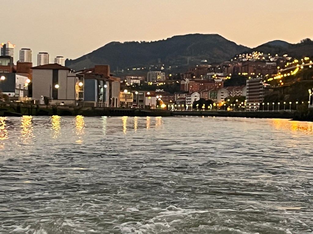 O barco navegou mais um pouco tendo a ilha Zorrotzaurre na margem direita. Aí já sem edifícios de renome, apesar de interessantes e com as luzes refletidas na água, o cenário era deslumbrante também, tendo como pano de fundo, a montanha.