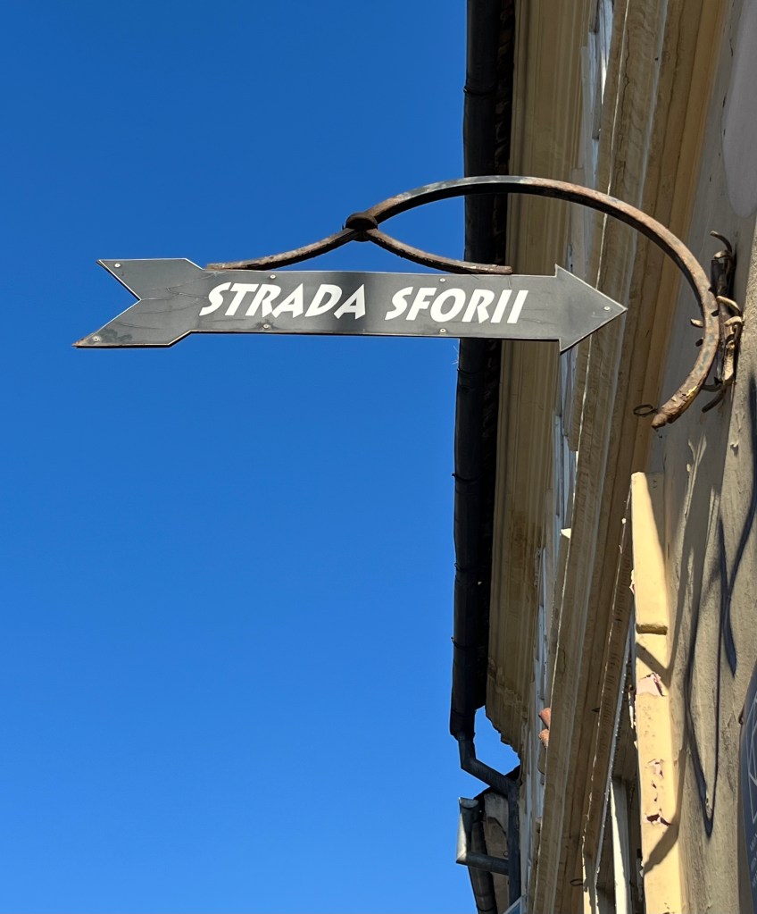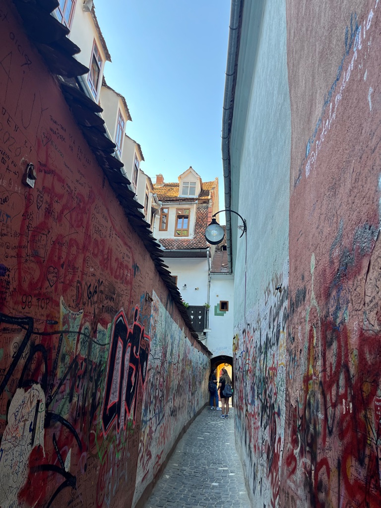 Quando descemos tínhamos em mente ver algo único: a Strada Sforii. Está situada perto do Portão Șchei e é perpendicular à Strada Cerbului. Apesar de ser uma rua estreita não se torna claustrofóbica. É pena que alguns pseudo-artistas estraguem o trabalho de outros, pois era suposto apresentar street art em pleno. Mas mesmo assim vale a pena!