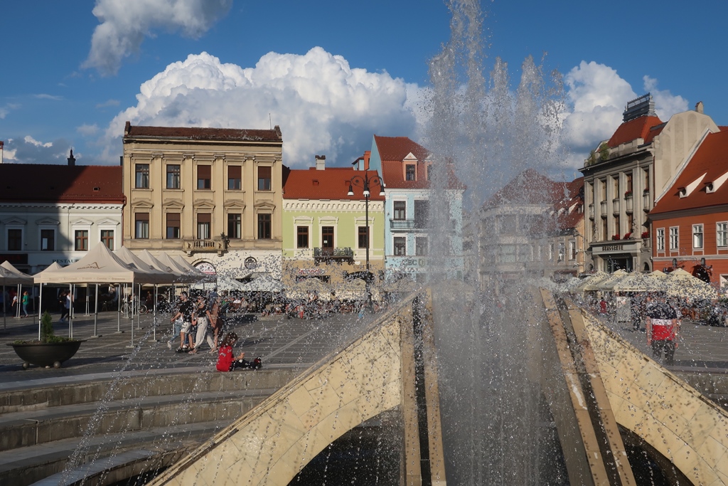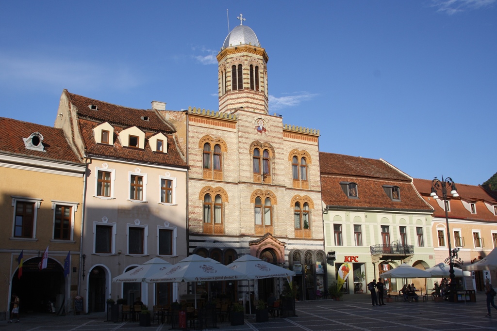 Feito o check-in e carro estacionado, estávamos prontos para começar a desbravar “terreno”. Fomos em direção à Piata Sfatului e aí tínhamos um “mundo” à nossa espera. No centro da Praça havia uma fonte que chamava a nossa atenção devido aos seus repuxos oscilantes. Demos um giro por ali apreciando a imensidão de edifícios interessantíssimos de cores variadas, destacando-se a Câmara, a Igreja da Dormição da Mãe de Deus (Biserica “Adormirea Maicii Domnului”) e um pouco da Igreja Negra (Biserica Neagra).