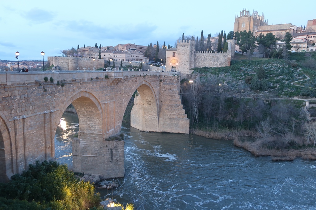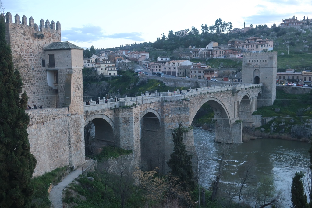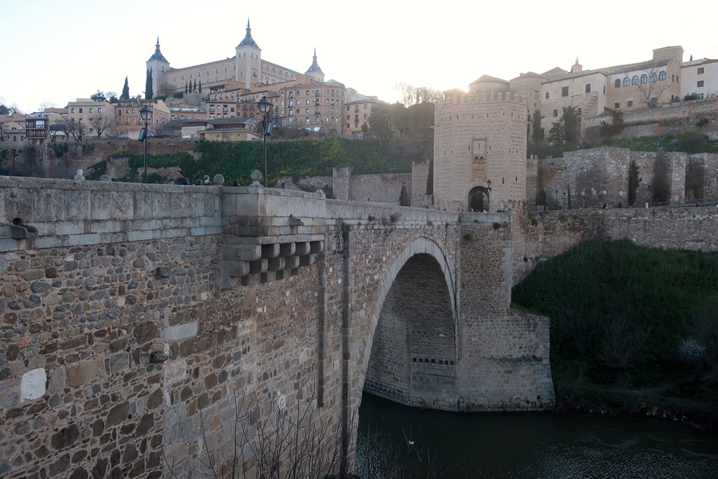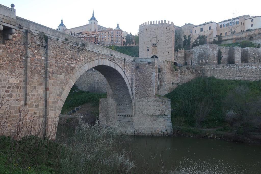 | Ponte (pedonal) de Alcántara construída no séc. IX de origem romana ponte em arco, sobre o rio Tejo, com elementos romanos e medievais e vistas do centro histórico de Toledo Localizada no sopé do Castillo de San Servando*, foi construída pelos romanos depois de terem fundado a cidade. Na Idade Média, era uma das poucas entradas para os peregrinos na cidade. Atualmente, possui dois arcos. Foi danificada e reconstruída no séc. X, quando um terceiro arco desapareceu, reduzido a um portão com um arco de ferradura. Foi uma das únicas pontes que davam acesso à cidade e na Idade Média era a entrada obrigatória para todos os peregrinos. Foi declarado Monumento Nacional em 1921 * Castelo de San Servando fica em frente à ponte de Alcántara foi reconstruído sobre as ruínas de um castelo árabe é uma das melhores obras de arquitetura militar mudéjar da Espanha. As torres são cilíndricas e tem arcos de ferradura. As portas são nitidamente mudéjares. Este castelo foi construído como mosteiro, porém, pelo facto de estar situado perto da ponte de Alcántara, foi transformado em fortaleza para defesa militar da cidade |