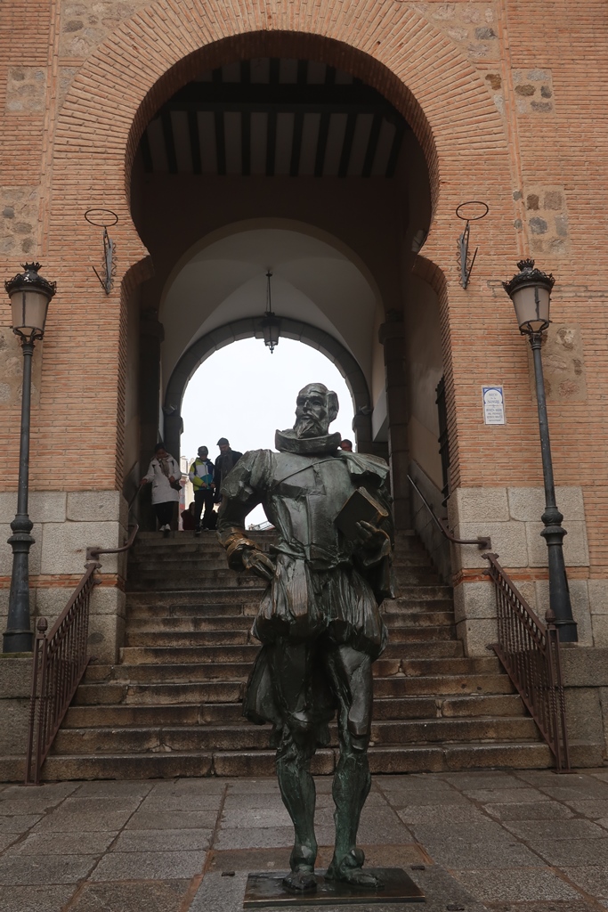 Daí encaminhámo-nos para a Plaza Zocodover. Muito interessante: pela série de ruas que saem dela, tornando-a dinâmica, pela variedade de edifícios e pelo Arco de Sangre através do qual se vislumbra uma parte mais baixa da cidade, sendo que descendo alguns degraus está a estátua Miguel de Cervantes (autor de Dom Quixote) que é ponto fotográfico obrigatório. (Estando por aí pode-se ir logo ao Museu de Santa Cruz – só fomos no dia a seguir).