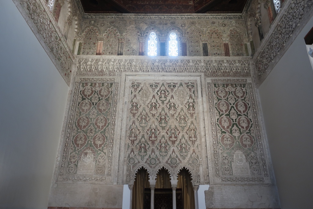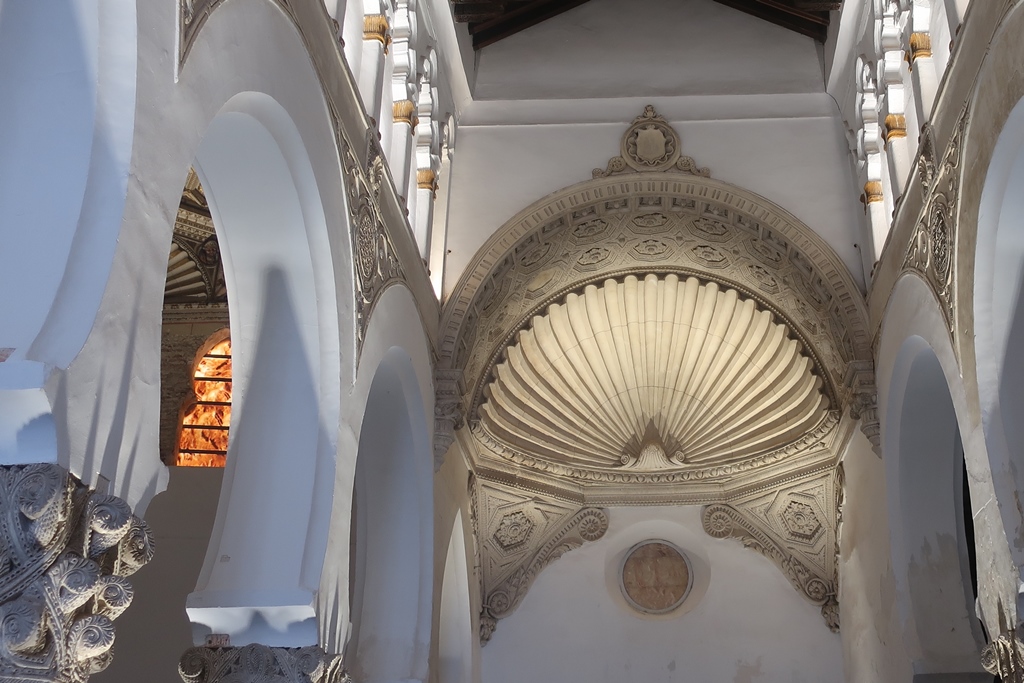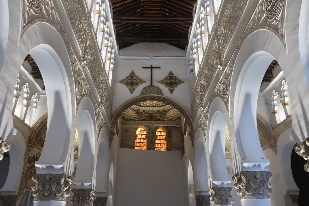 | SINAGOGA DE SANTA MARÍA LA BLANCA (Calle Reyes Catolicos 4) data do séc. XII, sendo a maior da cidade é uma construção mudéjar, construída em 1180, sendo o mais antigo edifício de sinagoga da Europa, ainda de pé. No início do séc. XV (1405) foi transformada em igreja tendo havido a preocupação de manter a beleza original com belos capitéis de pedra esculpida e paredes com painéis que fazem contraste com os arcos (brancos) em ferradura. É adornada em madeira e possui altares platerescos. (Plateresco – estilo arquitetónico exclusivo do Renascimento espanhol. É uma fusão dos componentes do mudéjar e do gótico flamejante: inclusão de escudos e pináculos ou fachadas divididas em três corpos. Apareceu no início do século XV e estendeu-se durante os dois séculos seguintes) Desde o início do séc. XIX que pertence e é preservada pela Igreja Católica. |