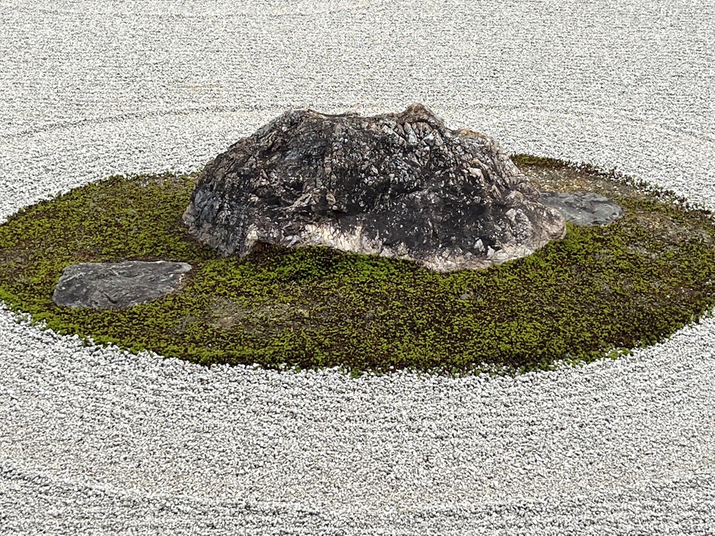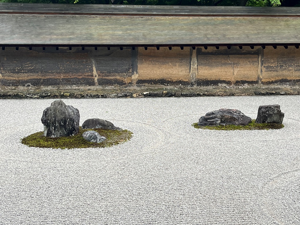 E com tudo isto eis-nos chegados ao Templo Ryoan-ji. É um dos templos zen mais conhecidos de Quioto. Ele possui um jardim um tanto diferente: trata-se de uma espécie de jardim seco, com areia e uma coleção de pedras.