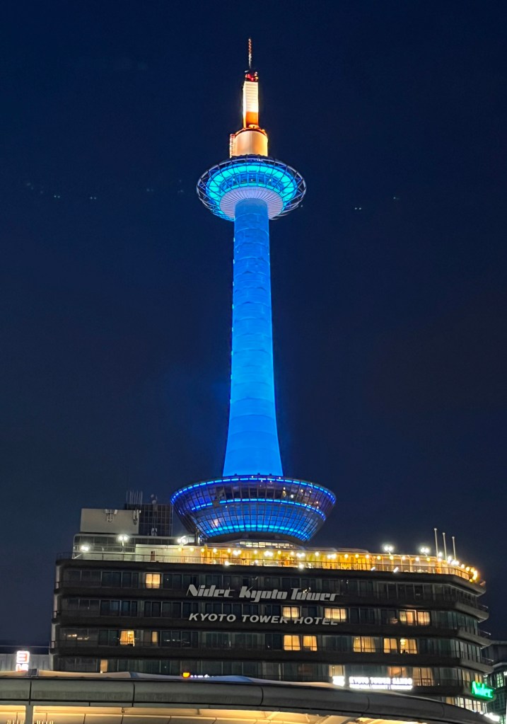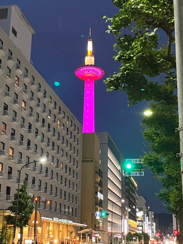 Depois destes momentos passados num local único fomos de autocarro até ao local onde estávamos hospedados – Hotel Rihga Royal, localizado a cerca de 10 minutos a pé da Estação de Quioto. A partir daí caminhámos até à estação e ao longo do trajeto íamo-nos deliciando com a Torre de Quioto que ia mudando de cor com frequência.