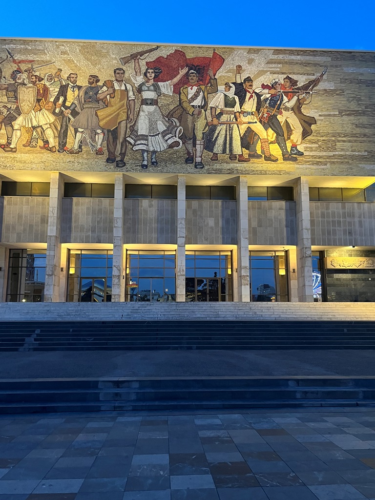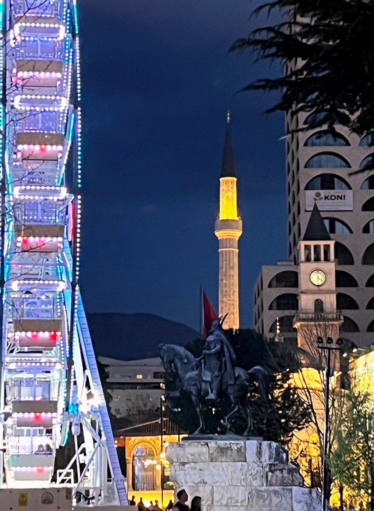Também na praça ficava o prédio do Palácio da Cultura, que abriga a Ópera e Biblioteca Nacional. Mais ou menos no centro estava uma fonte de água no chão, um tanque de guerra, a estátua de Skanderbeg, o herói nacional que conseguiu manter os turcos otomanos fora da Albânia durante 25 anos, no séc. XV, a Mesquita de Et’hem Bey e a Torre do Relógio.