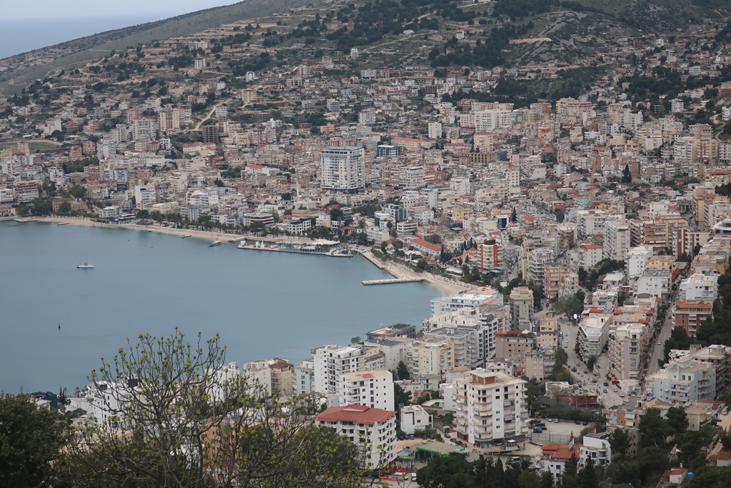 *(Sarandë fica no final da Riviera Albanesa e está cercada por vários pontos de interesse significativos: Parque Nacional Butrint, a vila de Ksamil, a nascente de água Blue Eye e o Castelo Lekuresi).