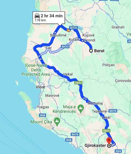 | DISTÂNCIAS Berat – Gjirokastër – 178 km – 2h 34 min Gjirokastër – Blue Eye – 35 km – 45 min Blue Eye – Sarandë – 22 km – 35 min – cerca de 240 km, 4h e 30 min– |