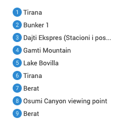 | B – LOCAIS DE INTERESSE 1. Tirana 2. Subúrbios de Tirana: Bunk’Art 1 Montanha Dajti (teleférico) Montanha Gamti Lago Bovilla 3. Berat 4. Desfiladeiro de Osum 5. Gjirokastër 6. Blue Eye 7. Parque Nacional Butrint 8. Riviera Albanesa (um cheirinho) Vlorë, Dhërmi, Himari, Sarandë e Ksamil Estrada SH8 entre Sarandë e Vlorë 9. Durrës 10. Shkodër 11. Fierze 12. Krüje |