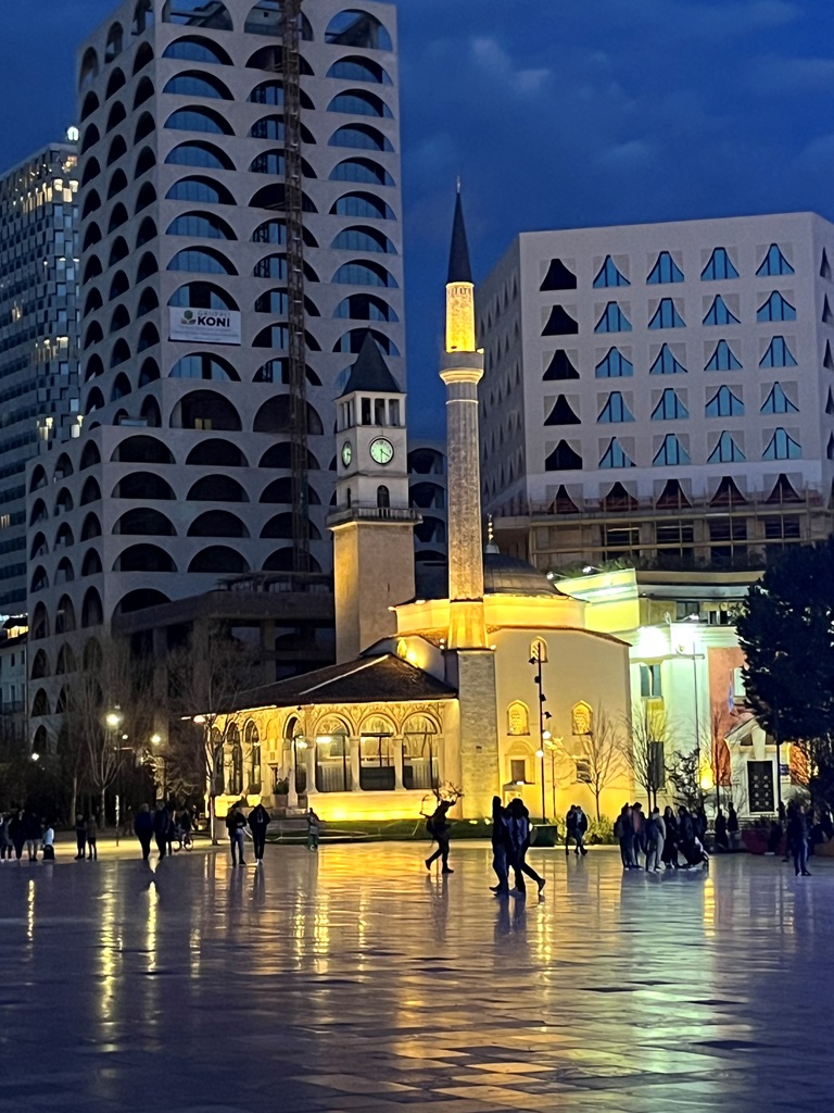 Começámos a caminhar no sentido do centro da cidade, tendo alcançado (por volta das 18h) a Praça Skanderbeg, principal praça da cidade. Ao longo do percurso contactámos com lojas, que mais pareciam pequenos mercados de rua, que vendiam desde fruta, a legumes, a peixe….. bem como com uma igreja e uma mesquita e uma mistura de estilos arquitetónicos.