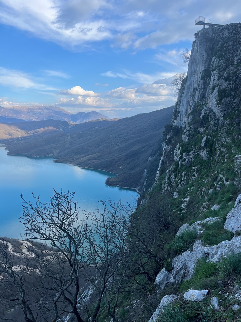 A manhã prosseguia com um trajeto de poucos quilómetros, 21, mas que representaram cerca de uma hora pois a estrada era picada: mau piso, muitas curvas, algumas zonas ascendentes, mas acompanhados de uma paisagem deslumbrante pois parte do trajeto foi feito ao longo de um desfiladeiro. Com tudo isto eis-nos chegados ao Lago Bovilla – um local a não perder.