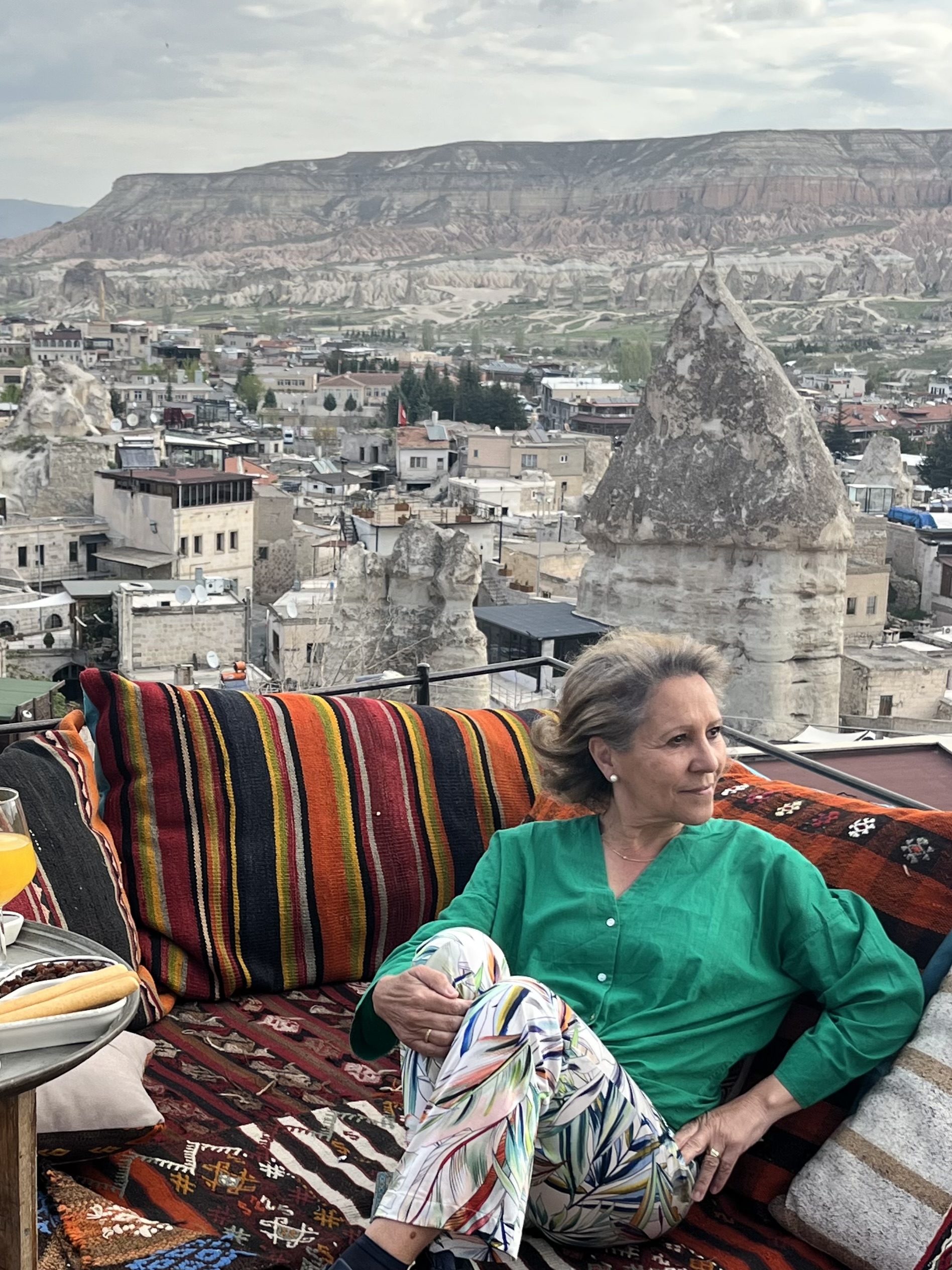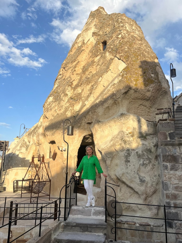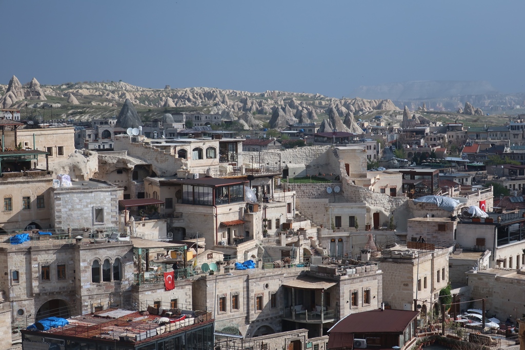Alcançado o local em causa apercebemo-nos de que era algo sui generis! Era constituído por 2 zonas: a baixa e a alta … até aí nada de extraordinário, sendo que para atingirmos as imediações do nosso hotel, o percurso para além de ser extremamente inclinado era labiríntico! Aventuras de viajantes! Mas depois de alcançado o local em causa – Mithra Cave Hotel – super compensou pois a vista era divinal: “milhentas” chaminés de fada: umas mais altas, umas maiores que outras e em diferentes localizações, terraços… Era difícil saber para onde dirigir o olhar! É algo inédito e único no mundo.