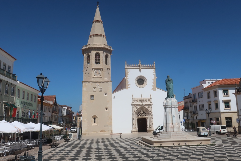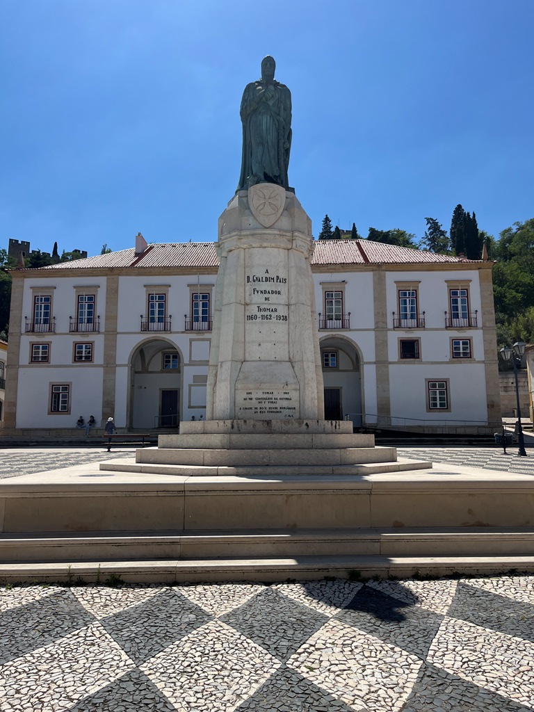 Alcançando o fim da rua chegámos a uma grande praça – a Praça da República, impondo-se no centro a Estátua de Gualdim Pais – Mestre Templário – Fundador de Tomar, tendo também a Igreja de São João Baptista e os Paços do Concelho (por detrás da estátua).