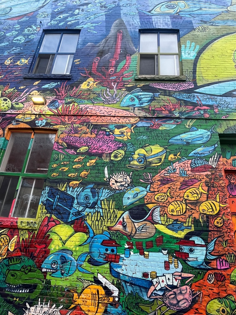 Como o pequeno-almoço não estava incluído e porque soubemos que não muito longe de uma zona que queríamos explorar – Graffity Alley, havia um local famoso onde se comiam cinnabun pancakes – Stacked Pancake & Breakfast House, aí fomos nós (para a fila) para experimentar essa iguaria. Gostámos. Depois deixámo-nos “perder” nas ruas e ruelas de Street Art, havendo alguns artistas a pintar.
