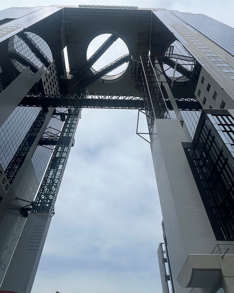 De seguida fizemos uma viagem no tempo: do passado para um presente modernista! Fizemos um trajeto de autocarro para as imediações do Edifício Umeda Sky, também conhecido como Observatório do Jardim Suspenso. Começámos por apreciar os jardins com paredes cobertas por vários tipos de plantas bem como observar o Edifício Umeda Sky de baixo para cima, autenticamente, pois colocámo-nos mesmo por baixo dele.