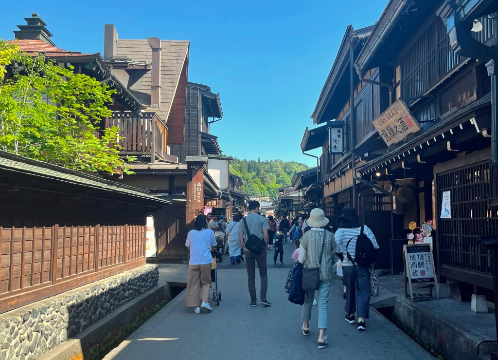 Depois desses momentos num local único, tínhamos que prosseguir viagem para alcançar Takayama. Chegámos lá por volta do meio-dia. Deambulámos pela ponte Nakahashi, donde se adivinhava um pouco da simpática cidade de Takayama, tendo ido depois para o bairro Sanmachi Suji: velho centro histórico com casas tradicionais de madeira, bonito e bem preservado. Fomos deambulando ao longo da rua Kami-Sannomachi, considerada a mais famosa e pitoresca, repleta de lojas de todo o tipo.