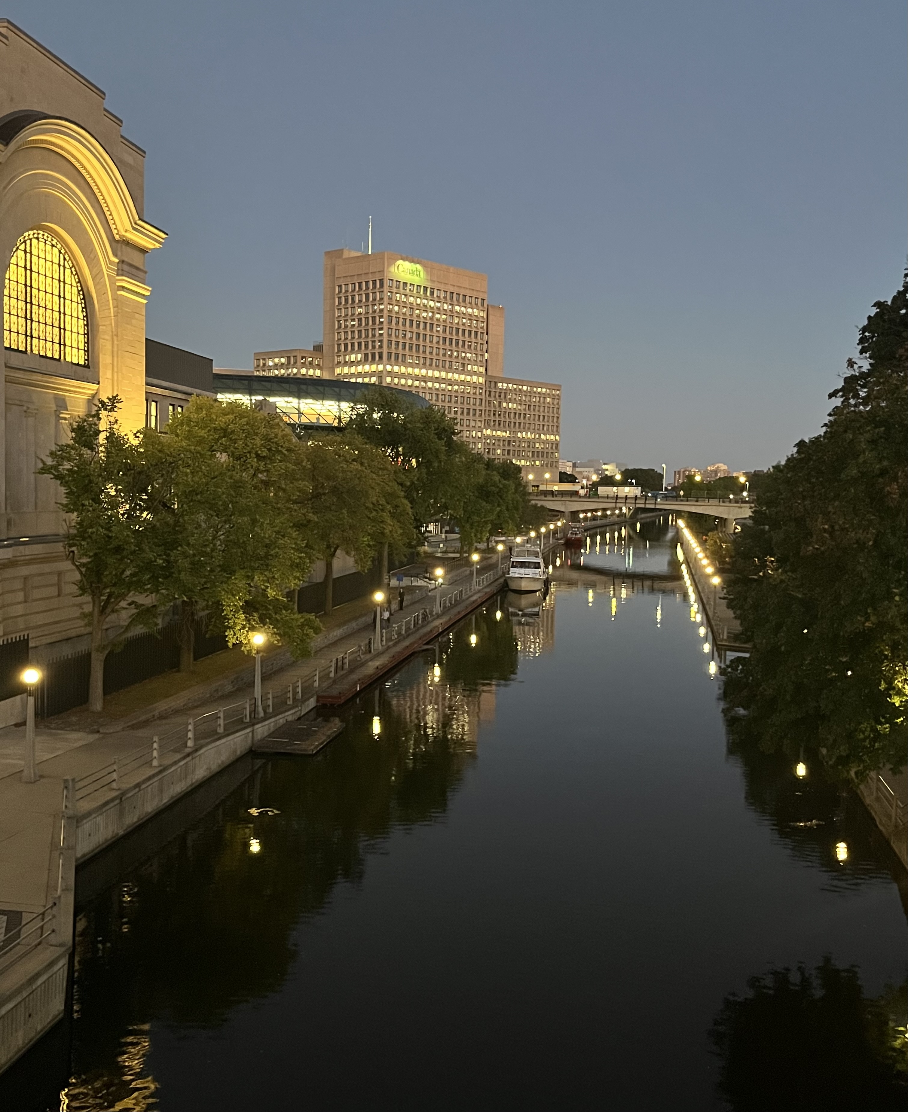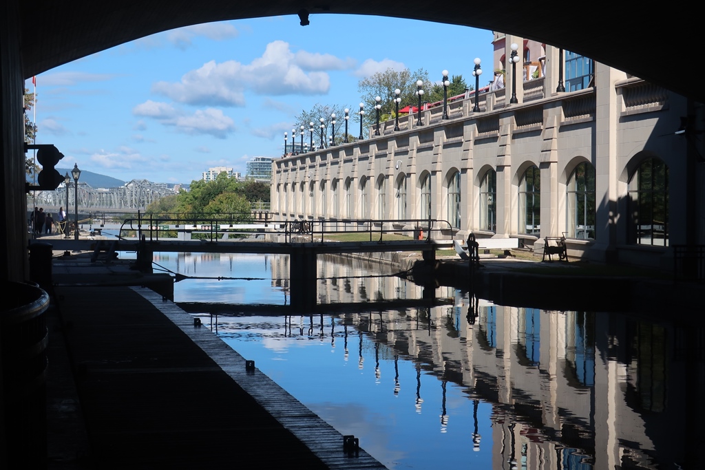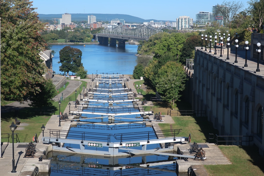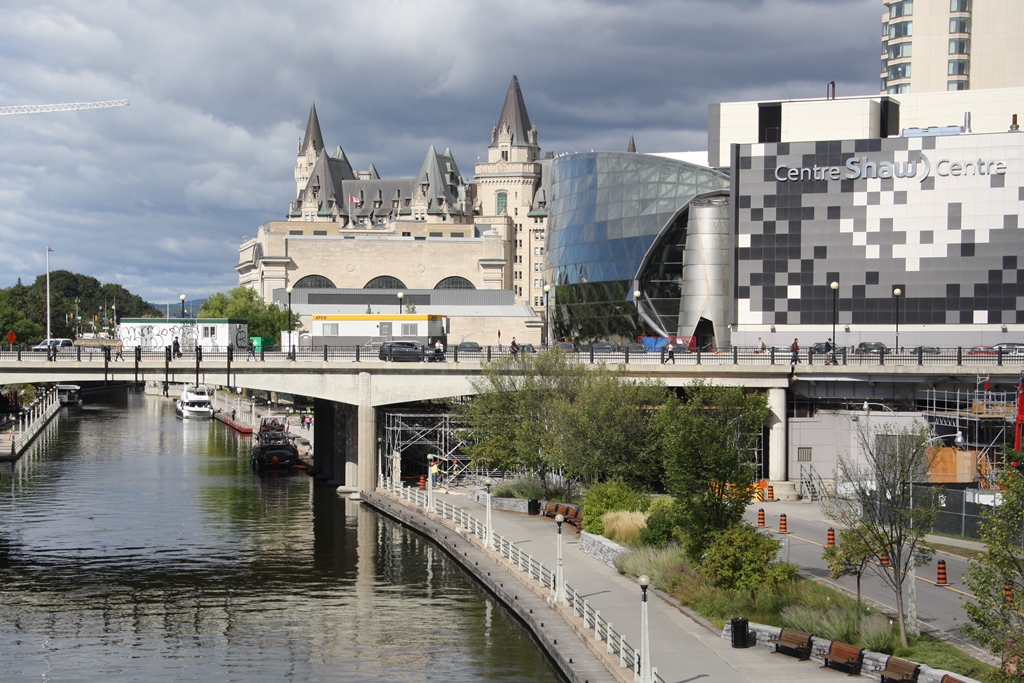 | Canal Rideau é um famoso canal histórico e local recreativo popular (que se estende por mais de 200 km) construído no século XIX (inaugurado em 1832) como medida estratégica para ligar Ottawa ao Lago Ontário (ele liga o Rio São Lourenço, no Lago Ontário, em Kingston, e ao Rio Ottawa, perto de Parliament Hill em Ottawa) os barcos de recreio navegam nas suas águas (entre maio e setembro) para oferecer um ângulo turístico diferente de Ottawa; durante os meses mais quentes, o Canal Rideau é um destino popular para caminhadas, corridas e ciclismo ao longo de seus 202 km; no inverno, o canal transforma-se na maior pista de patinagem ao ar livre do mundo – é reconhecido como Património Mundial pela UNESCO desde 2007 – O Canal Rideau mantém a maior parte das suas comportas e fortificações manuais: é interessante a área onde ficam as chamadas “Ottawa Locks”, as comportas do canal, que ficam próximas do famoso hotel Fairmont Château Laurier e no encontro com o Rio Ottawa. |