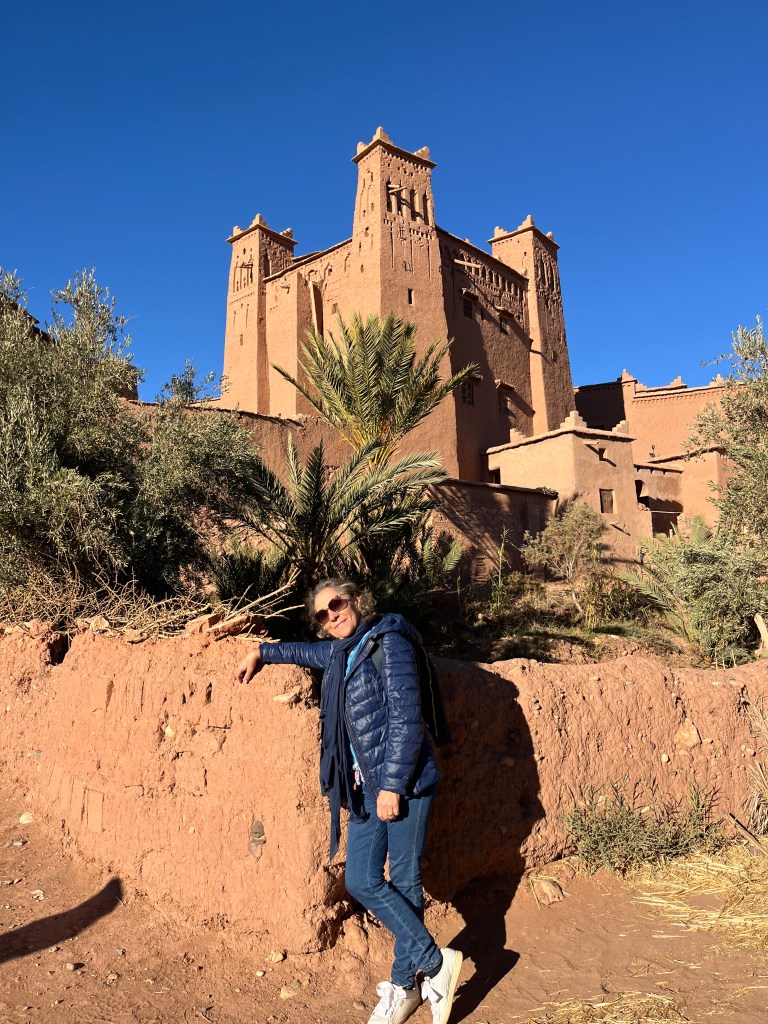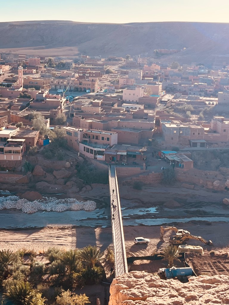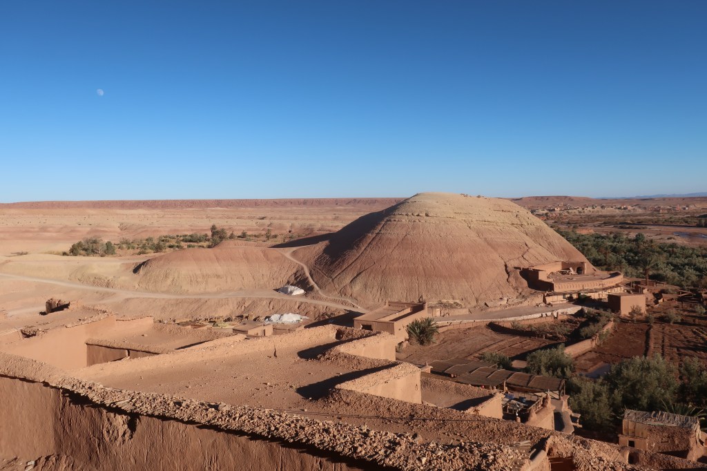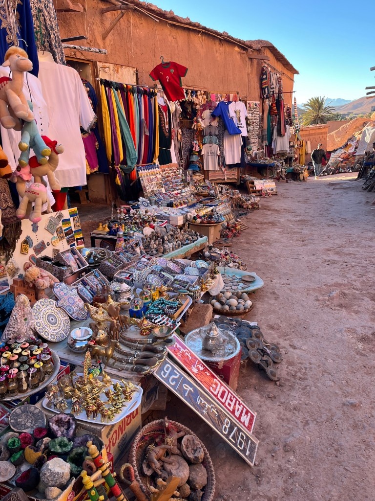 Aí íamos nós explorar algo mítico: um conjunto de kasbahs construídos sobre uma colina isolada, com múltiplas casas (umas modestas outras mais elaboradas, parecendo pequenos castelos), funcionando algumas como pequenas lojas de artesanato com uma diversidade incrível de artigos – desde pinturas a tapeçarias, souvenirs, peças de roupa, dando um colorido muito interessante que contrastava com o tom de terra dos edifícios. O interior tinha passagens estreitas e miradouros que ofereciam vistas amplas sobre o vale e o deserto.