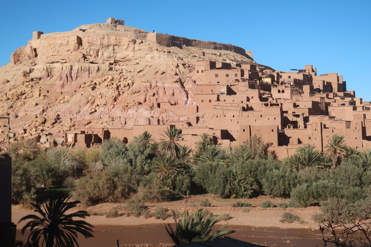 tínhamos uma perspetiva de 360 graus, o que enriquecia mais o cenário: o rio com as suas pedras coloridas, o celeiro, as palmeiras, a ponte e o casario fora das muralhas. É toca a esquecer o esforço necessário para se atingir a zona mais elevada do ksar pois do cimo da colina, o vale tem outro encanto!