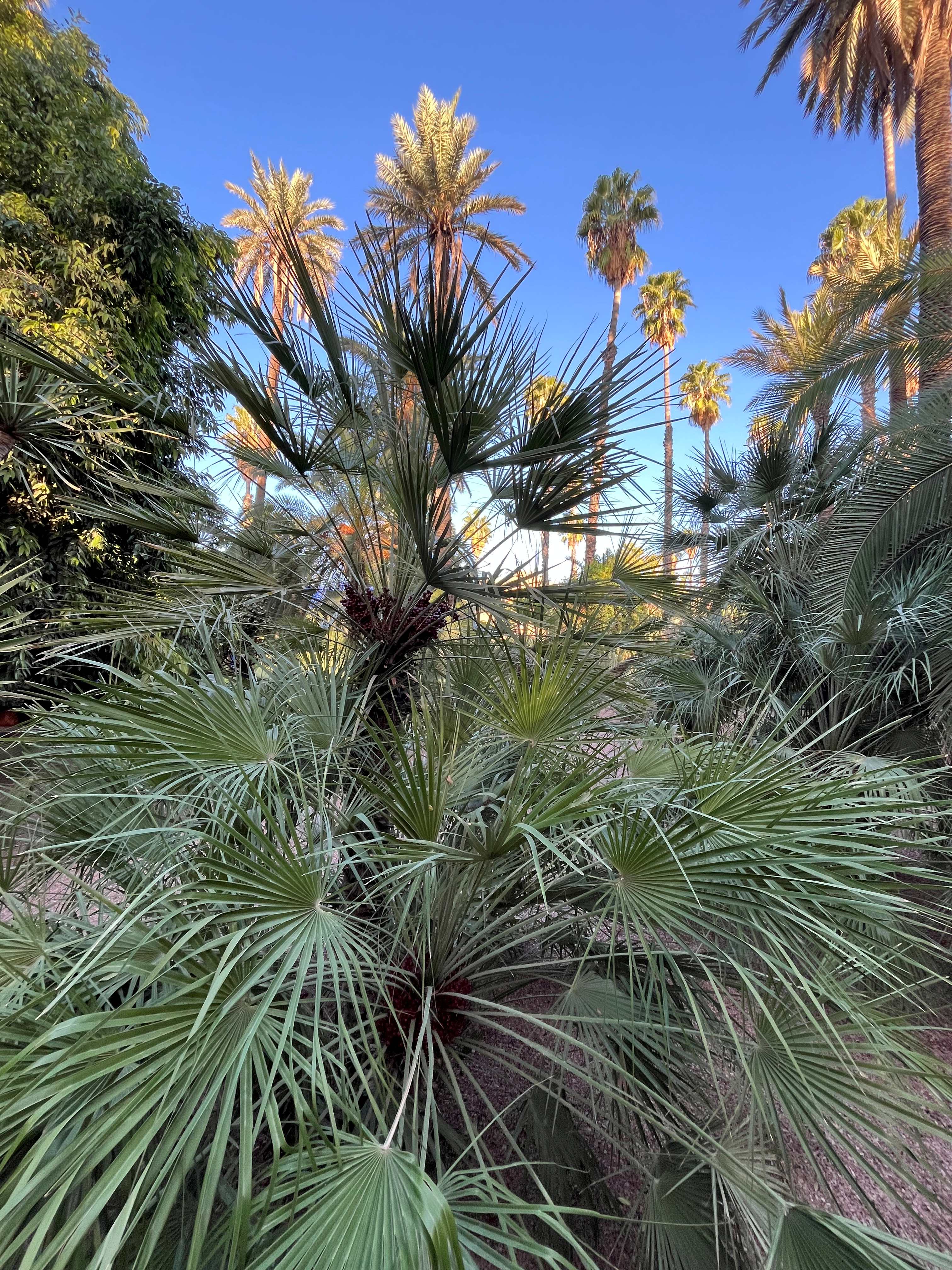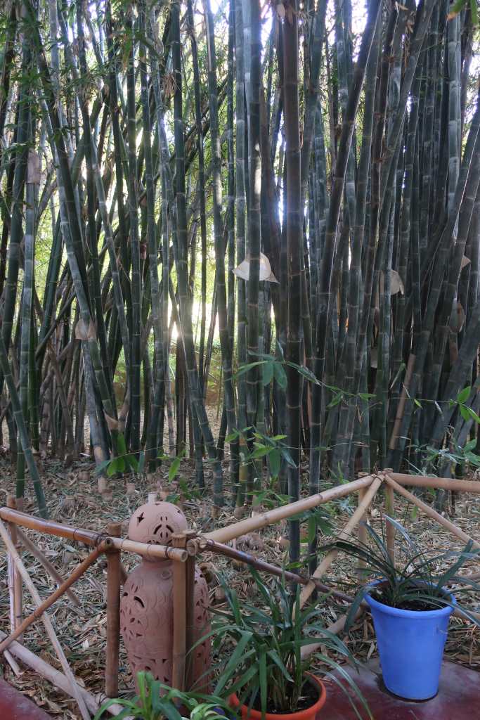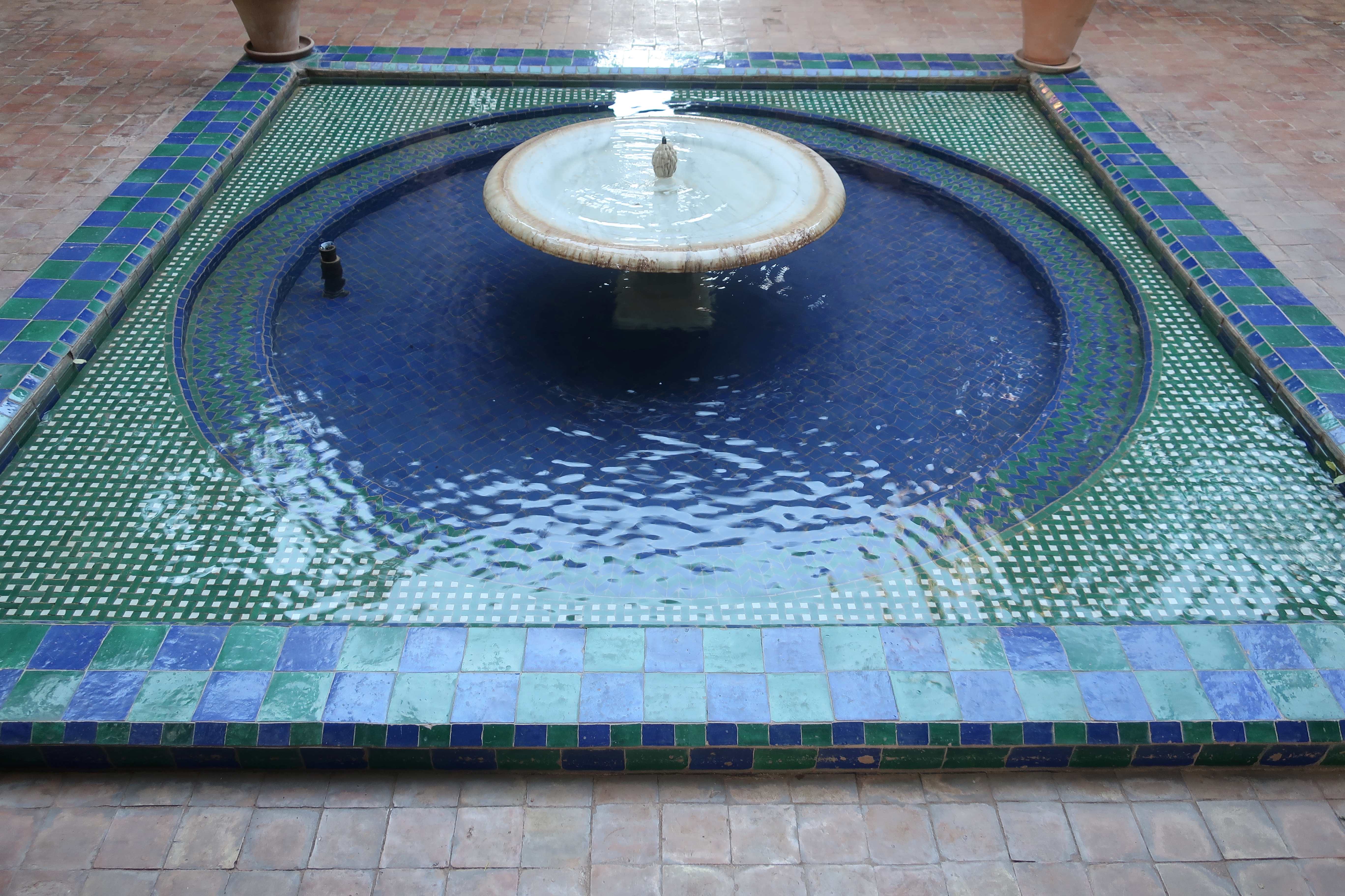 Passeio pelo jardim: caminhos com sombra natural oferecidos por bambus e palmeiras. Apresenta também um lago central (com peixes) e uma imensidão de cedros, salgueiros, alfarroba, jasmim, piteiras, lírios, uma coleção de cactos e espécies tropicais (por exemplo: lótus, buganvílias…) cuidadosamente dispostas em torno de tanques, canais e fontes e cantos com bancos, representando um verdadeiro refúgio de frescura na época quente.