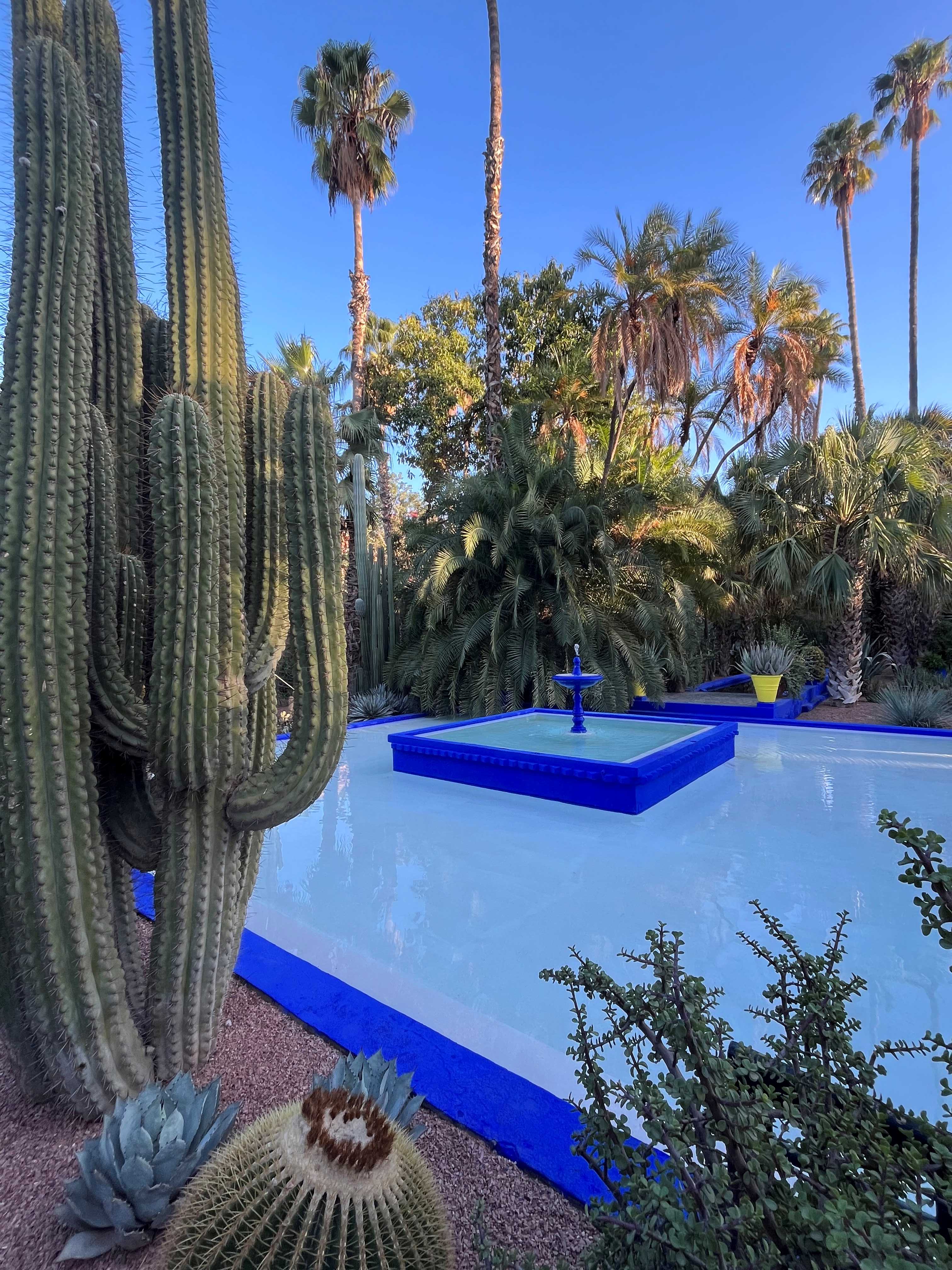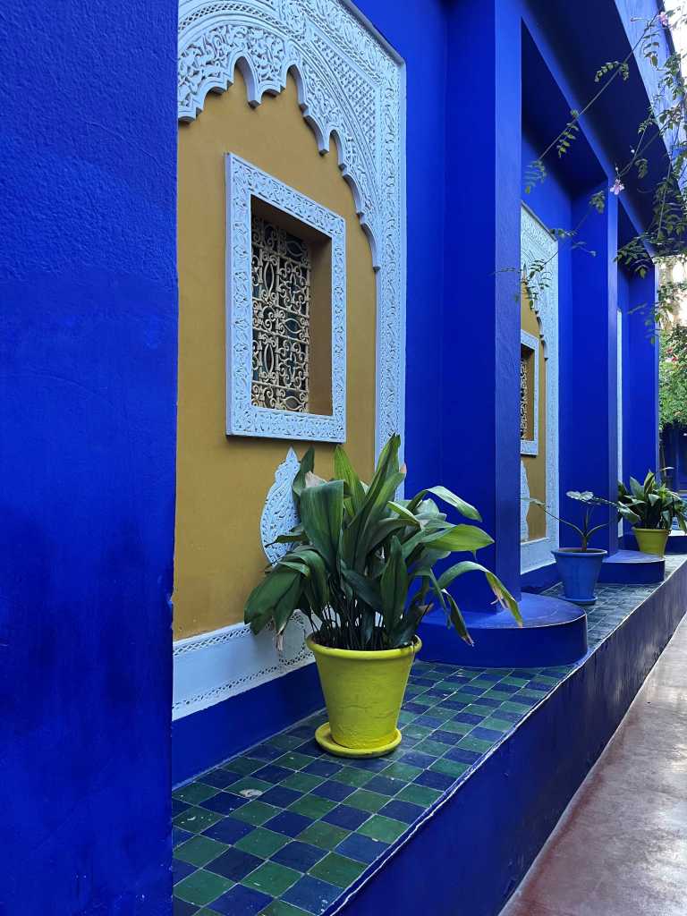Arquitetura Art Déco e mourisca: a antiga casa/atelier de Majorelle, de estilo Art Déco com elementos marroquinos, pintada no intenso azul Majorelle, é um dos grandes ícones visuais do jardim.